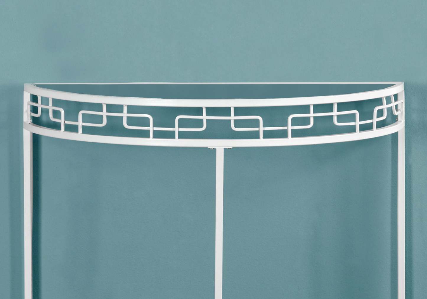 Accueillez vos invités avec style grâce à une table console en métal en forme de demi-lune qui sera parfaite comme table console d'entrée ou dans votre salon. Idéale pour les petites maisons, les condos ou les appartements, cette table d'appoint est délicatement conçue avec un cadre en métal blanc et un plateau en verre trempé épais offrant amplement d'espace pour votre décoration ou d'autres accessoires. Le design géométrique se démarque parfaitement.