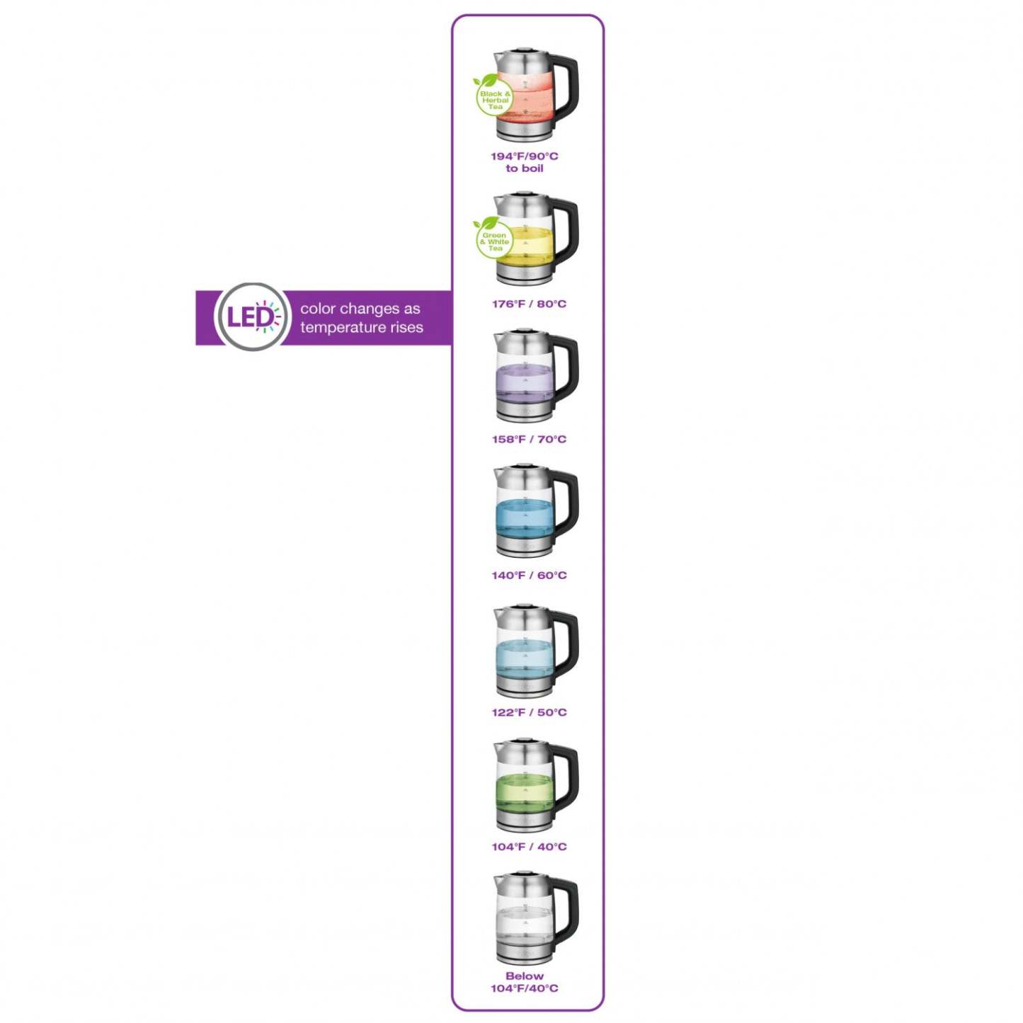 Élégant. Stylé. Élancé. Cette bouilloire peut être utilisée pour faire bouillir de l'eau et infuser votre thé préféré à la température exacte requise. Les 7 températures pré-réglées s'adaptent à une variété de thés ; du oolong au chai, en passant par les tisanes et le thé noir. La base pivotante à 360 degrés avec rangement du cordon vous permet de servir sans fil et de garder votre plan de travail dégagé. Les lumières LED changent à mesure que la température augmente pour indiquer la température de l'eau atteinte par la bouilloire. La tasse de thé parfaite est à portée de main d'un simple bouton !