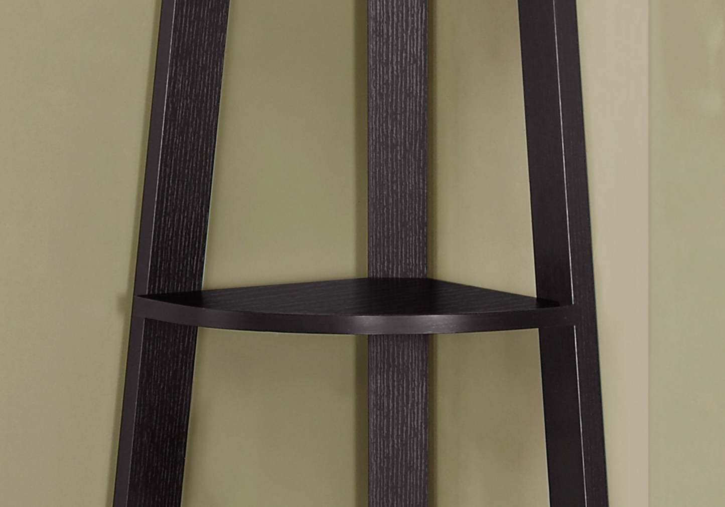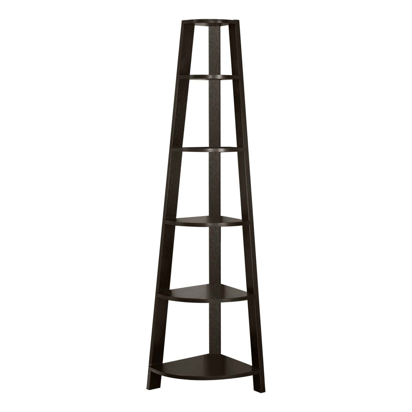 Installez facilement cette étagère et laissez-la faire son travail ! Regardez comme l'étagère s'intègre bien dans un coin de votre salon, bureau ou chambre, vous permettant d'exposer des livres et toutes sortes de décorations facilement. Profitez d'un endroit souvent difficile à aménager : le coin. Maximisez le rangement et l'affichage avec une pièce moderne qui vous aidera à utiliser tout l'espace disponible grâce à 5 étagères fixes de style plateau. Trois pieds en poutres robustes assurent l'intégrité de la structure de cette étagère d'angle en bois de finition brun foncé, couleur expresso. Du matériel anti-basculement est inclus pour une stabilité supplémentaire.