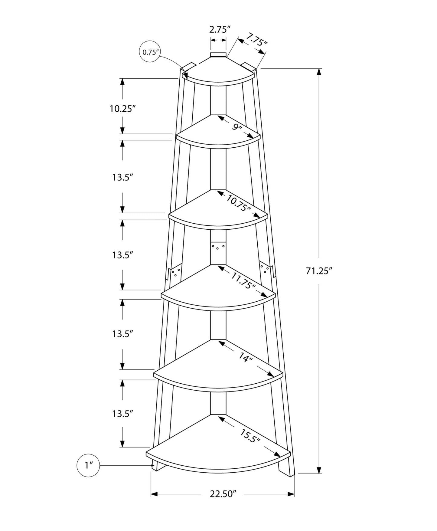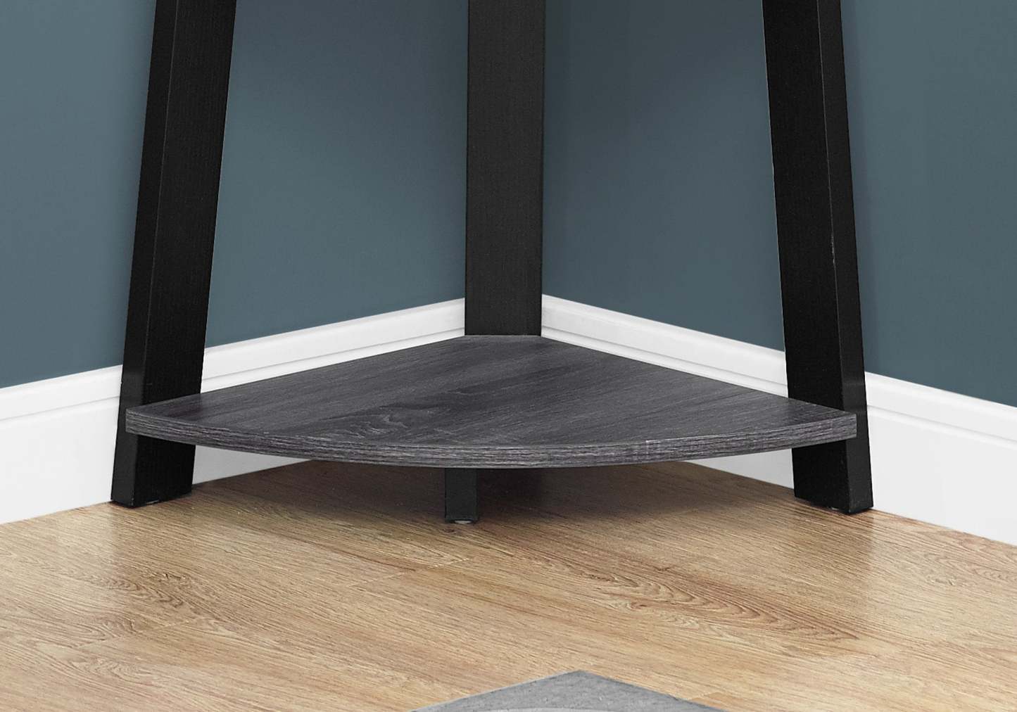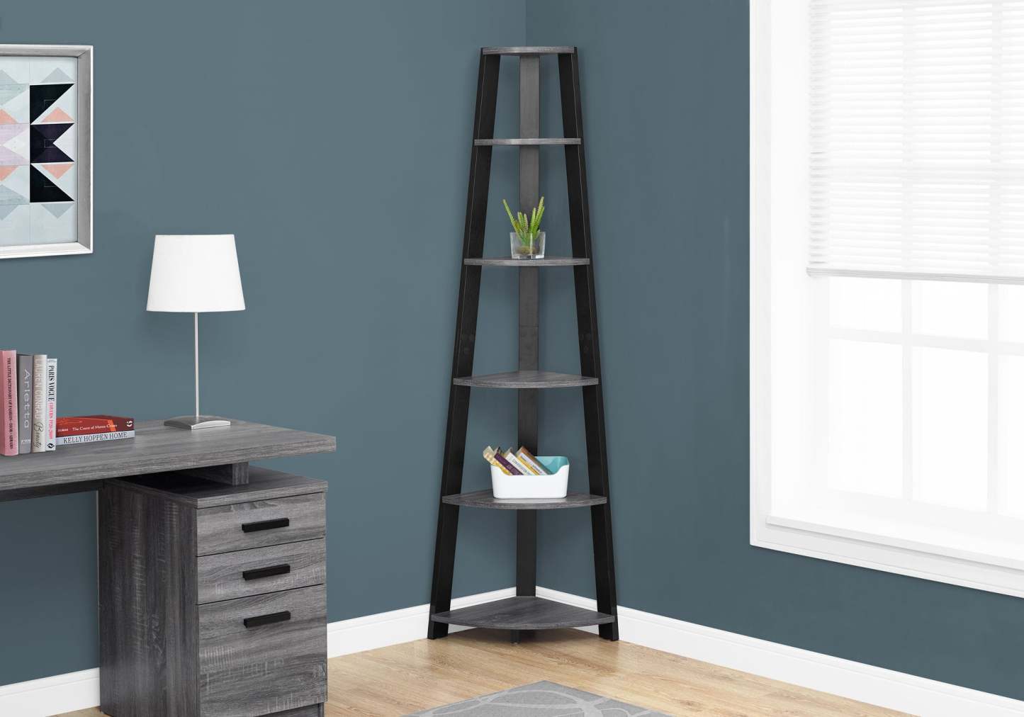 Installez facilement cette étagère et laissez-la faire son travail ! Regardez comme la bibliothèque en bois gris et noir s'intègre bien dans un coin de votre salon, bureau ou chambre, vous permettant d'exposer des livres et toutes sortes de décorations facilement. Profitez d'un endroit souvent difficile à aménager : le coin. Maximisez le rangement et l'affichage avec une pièce moderne qui vous aidera à utiliser tout l'espace disponible grâce à 5 étagères fixes de style plateau. Trois pieds en poutres robustes garantissent l'intégrité de cette étagère à l'échelle d'angle. Du matériel anti-basculement est inclus pour une stabilité supplémentaire.