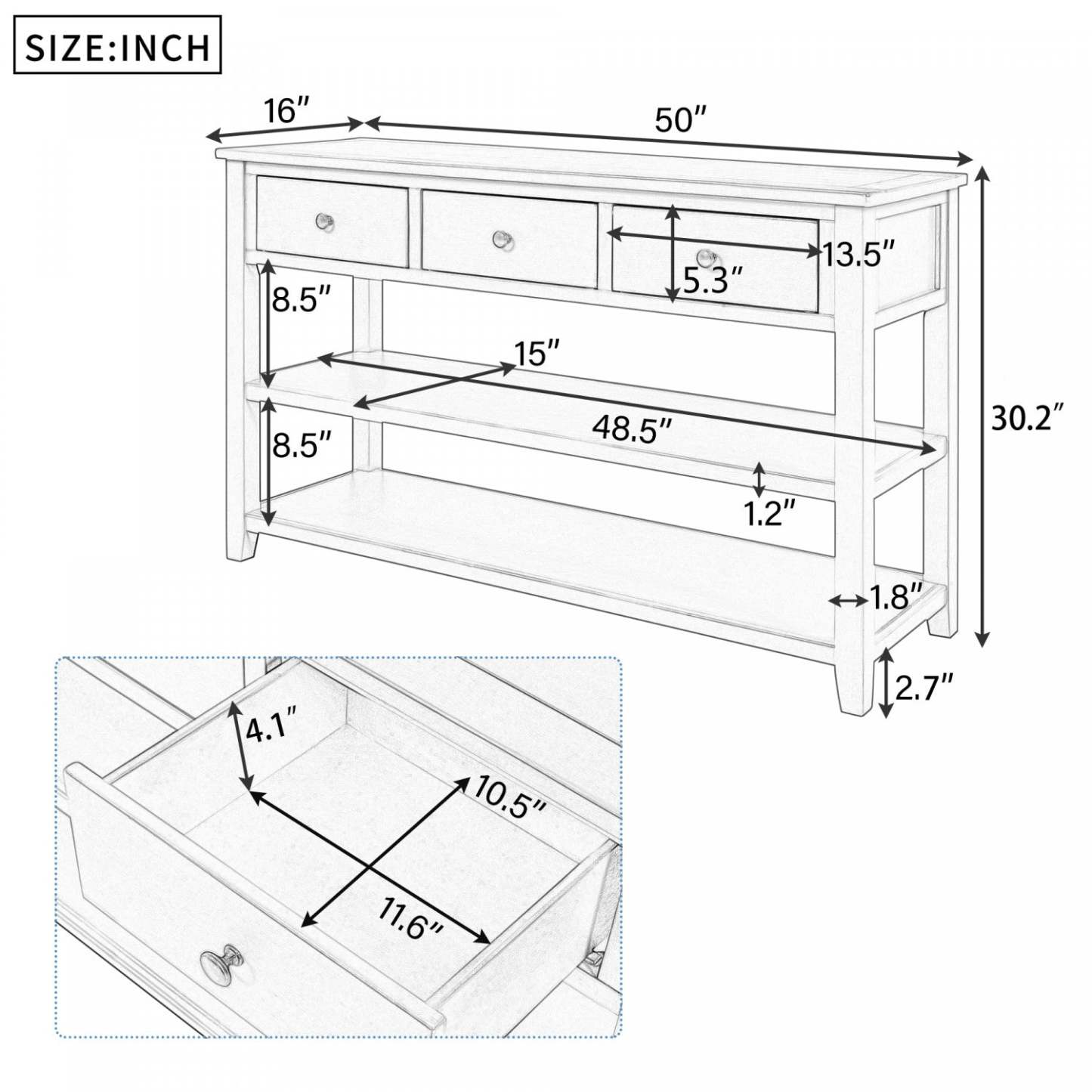 Wendy Table console en bois massif avec 3 tiroirs et 2 étagères ouvertes, armoire d'appoint blanc antique | Console Wendy En Bois Massif Avec 3 Tiroirs Et 2 Etageres Ouvertes, Blanc Antique