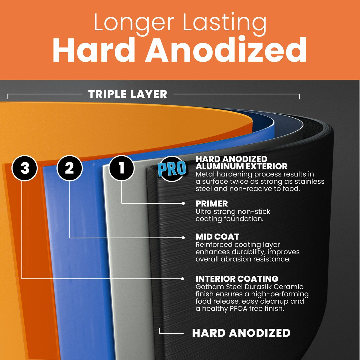- Anodisation dure : Conçu pour durer, l’ensemble de casseroles Gotham Steel Pro Premier est fabriqué en aluminium anodisé dur, plus résistant que l’acier inoxydable ou l’aluminium ordinaire, assurant une conduction thermique rapide et uniforme à travers les ustensiles de cuisine, tout en résistant à l’usure et en garantissant des années d’utilisation exceptionnelle pour chaque pièce.