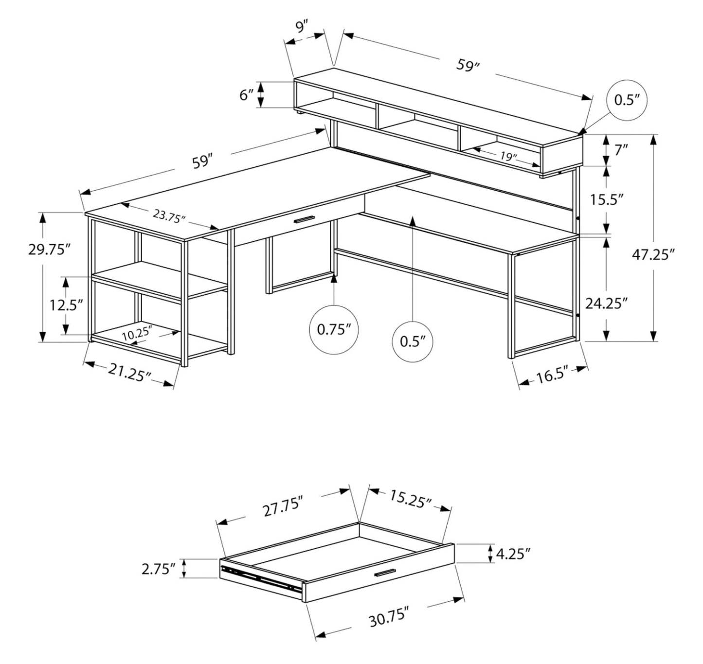 Profitez d'un espace de travail aéré grâce à ce bureau Oaklee spacieux. À gauche, deux étagères fixes et ouvertes sont accessibles de tous côtés. Le grand plateau du bureau chevauche le module de rangement de droite pour créer une seconde surface de travail plus basse. Un meuble de rangement suspendu comporte trois niches. Pour ranger vos petites fournitures, ce bureau d'angle est équipé d'un tiroir avec poignée en métal. Un fin piètement en métal à la finition contrastée soutient les panneaux stratifiés. Ce bureau d'ordinateur en forme de L optimise l'espace lorsqu'il est placé dans un angle, mais sa finition soignée sur toutes ses faces lui confère une allure élégante quel que soit son emplacement dans un bureau.