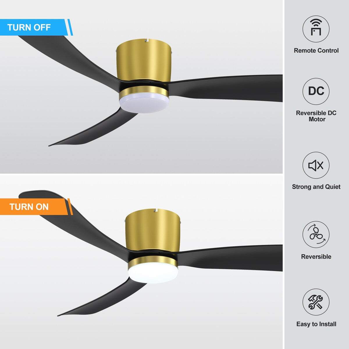 Ce ventilateur de plafond de 132 cm (52 ​​pouces) est équipé d'un moteur CC réversible à 6 vitesses écoénergétique, intégré dans un boîtier épuré avec des bras architecturaux supportant 3 pales. Il dispose d'un éclairage LED 3000K et se contrôle facilement grâce à la télécommande incluse. Son moteur CC ultra-silencieux est 70 % plus efficace que les ventilateurs CA traditionnels.