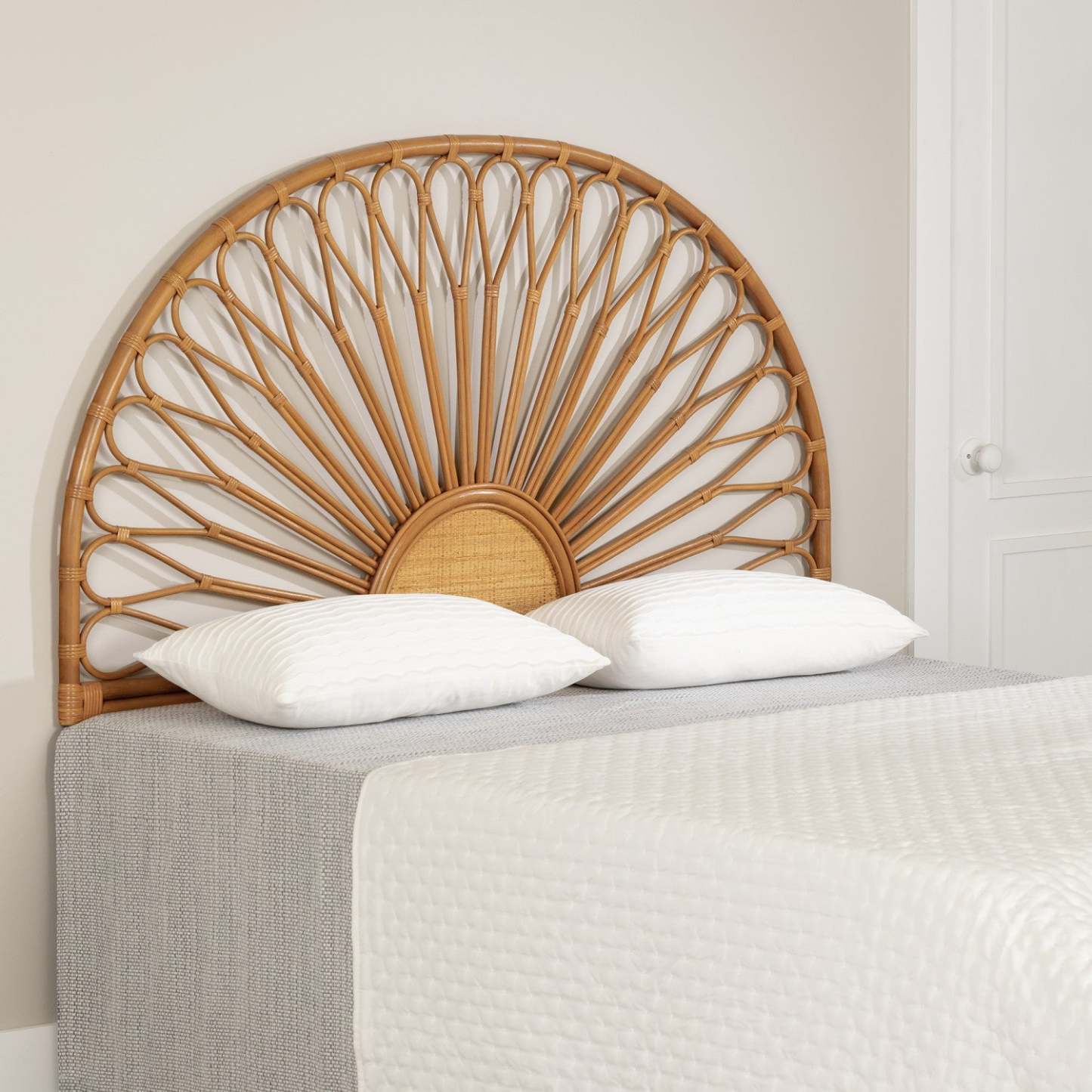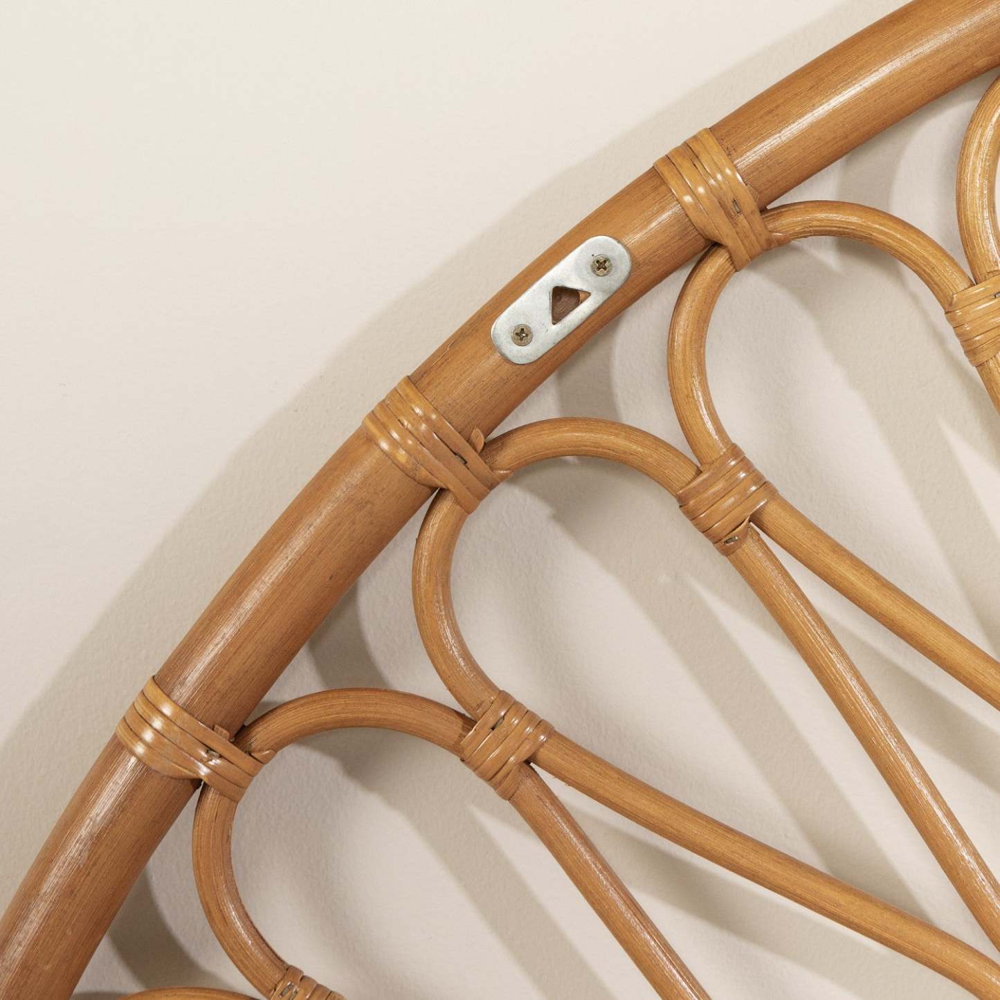 La tête de lit donne souvent le ton à la décoration de la chambre. Offrez à votre chambre parentale un style bohème authentique et lumineux avec cette tête de lit murale en rotin de notre collection Balka ! Son originalité ? Un motif délicat évoquant une fleur. Fabriquée artisanalement avec soin, cette tête de lit est une pièce unique. Vous apprécierez les variations de couleur et les nœuds du bois, différents pour chaque pièce. Associez-la à un sommier plus sobre et ajoutez du linge de lit et des accessoires aux tons chauds pour une ambiance accueillante. L'avantage de cette tête de lit ? Elle s'adapte à tous les sommiers grâce à sa fixation murale. Vous choisissez sa hauteur selon vos préférences lors de l'installation. Un système d'ancrage facilite la pose : crochets et vis (non fournis) suffisent. Aucun montage ni bricolage complexe n'est nécessaire !