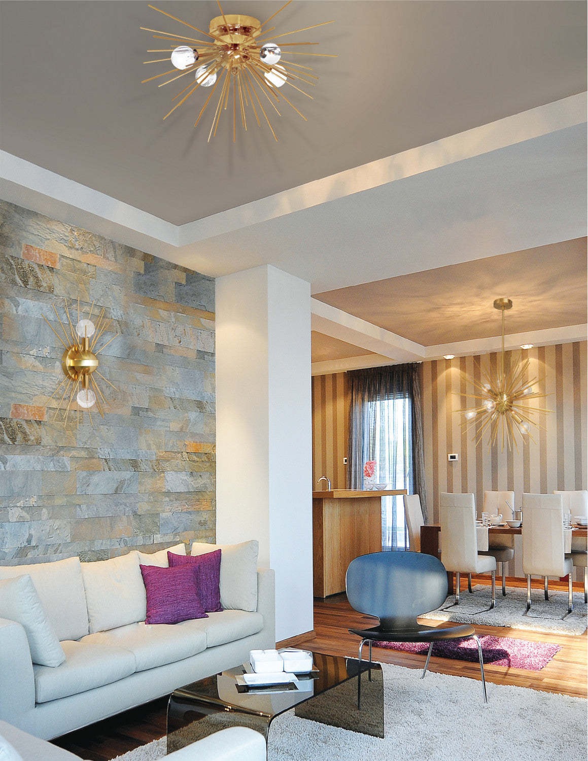 L'étoile Véga est la plus brillante de la constellation de la Lyre. Voilà l'inspiration du style scintillant de la famille d'éclairage Vega. Elle ajoutera assurément du piquant où vous la placez dans votre demeure. L'armature en métal au fini de votre choix possède un globe central avec des tiges en métal qui rayonnent vers l'extérieur. Les ampoules sont placées dans l'amas de tiges, ce qui crée un environnement réfléchissant unique. De l'entrée à la cuisine, vous ajoutez instantanément un point central à la pièce et aux meubles autour, à l'aide de la famille d'éclairage Vega.