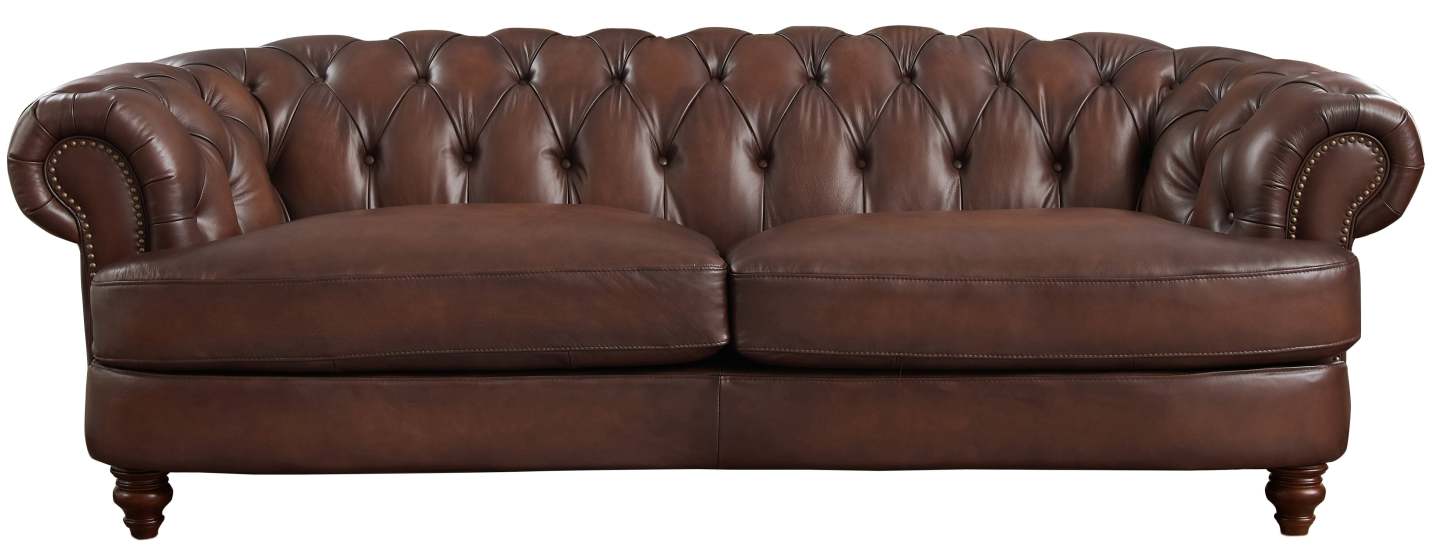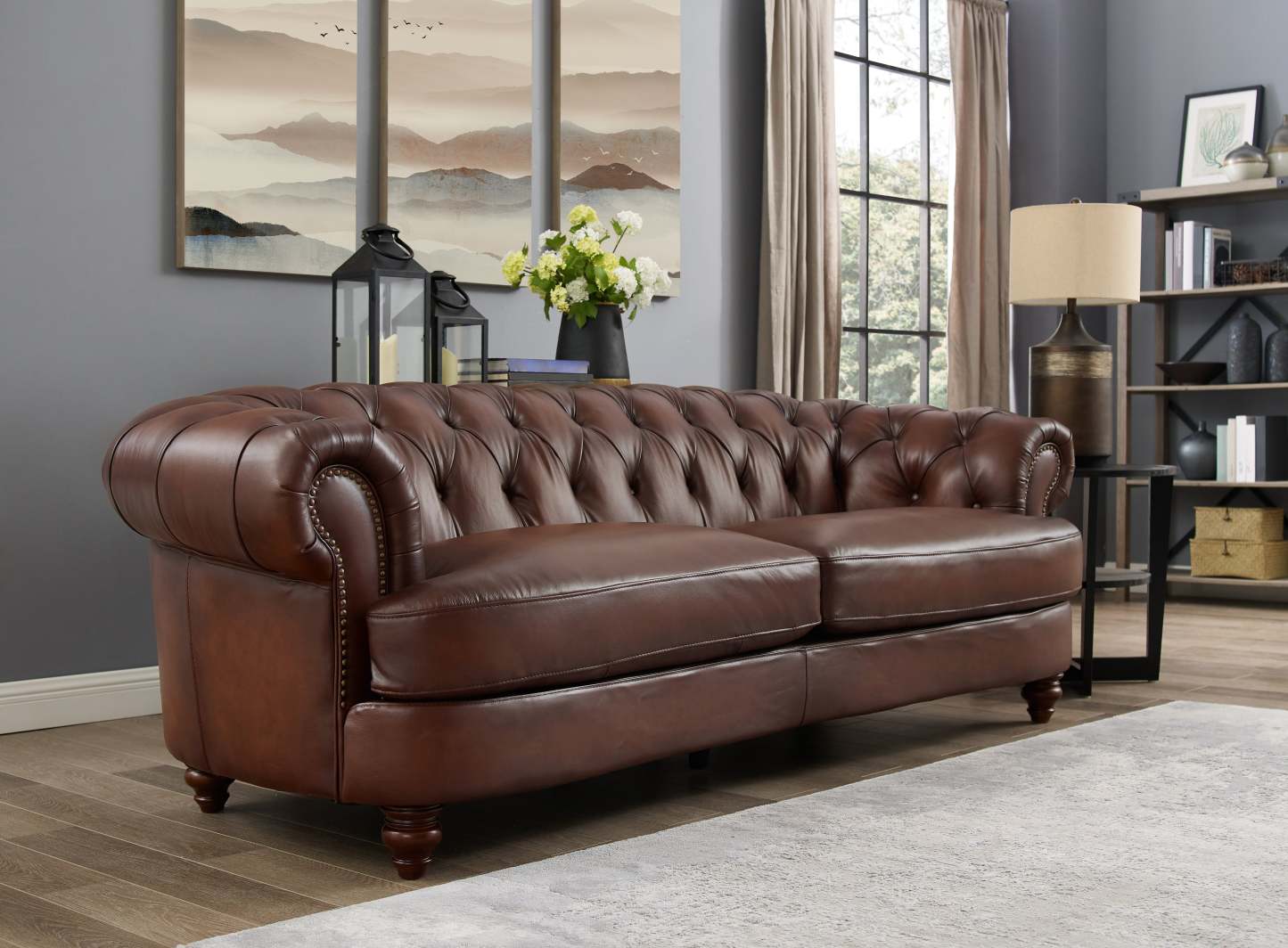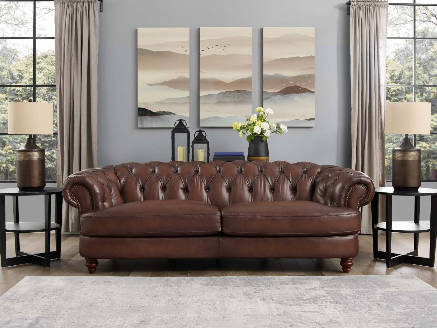 Le rail avant en forme de serpent, la garniture en clous en bronze appliquée à la main et les pieds en bois massif tournés ajoutent la touche finale parfaite à la collection de cuir Newport Top Grain. Le cuir luxueux de couleur marron foncé à plusieurs tons présente une subtile variation de zones claires et sombres, donnant au Brixton un attrait poli et accueillant.