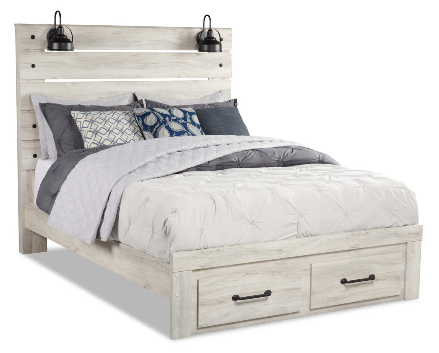 Éclairez votre détente au coucher avec ce lit de rangement queen Abby. Les styles rustique et industriel se rencontrent dans un bois à l'apparence naturelle avec une finition blanche claire et des clous en métal foncé. Deux appliques à LED intégrées dans la tête de lit offrent un éclairage supplémentaire pour les nuits où vous souhaitez rester éveillé et lire un chapitre de plus. Une paire de ports USB signifie que vous n'aurez plus jamais à vous soucier de la batterie de votre téléphone au milieu de la nuit. Deux tiroirs intégrés dans le pied de lit vous offrent un espace supplémentaire pour vos vêtements ou couvertures. Enroulez-vous sur l'Abby ce soir et laissez entrer un peu de lumière dans vos rêves.