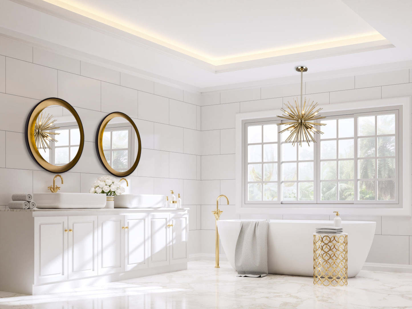 Les miroirs de la collection « Reflections » sont dotés d'un éclairage LED intégré. Ce dernier est commandé par un petit interrupteur marche/arrêt situé sur le miroir (qui permet également de régler l'intensité lumineuse). Ce modèle est bicolore : l'extérieur est en bronze huilé et l'intérieur est doré à la feuille. Les LED de ce miroir rétroéclairent la finition dorée (la LED se trouve donc derrière le miroir, par exemple).