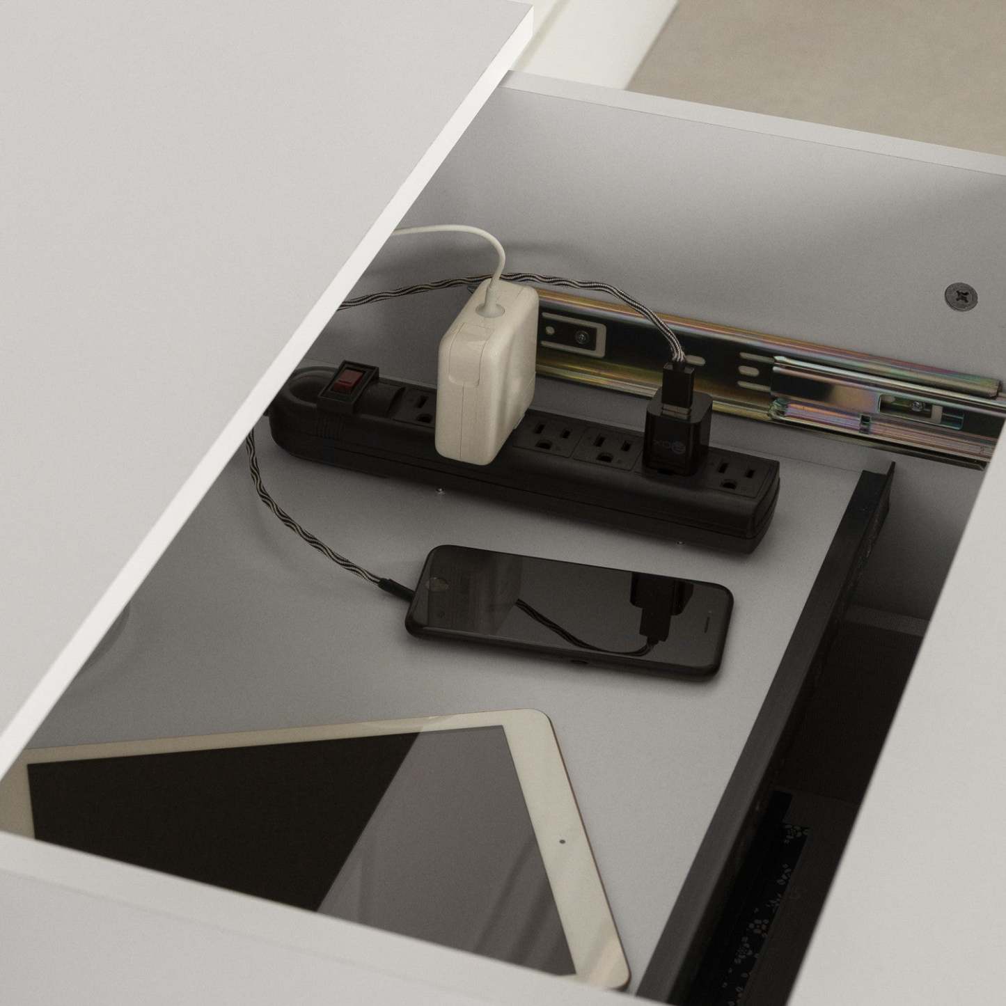 Table de chevet contemporaine. La table de chevet Vito allie confort moderne et savoir-faire transitionnel, pour un mariage parfait entre style minimaliste et fonctionnalité. Plus qu'une simple table de chevet, elle se transforme en station de charge grâce à son plateau coulissant. Ce meuble de chevet dispose de deux tiroirs spacieux pour ranger livres et effets personnels, équipés de glissières et poignées en métal élégant, ainsi que d'un plateau robuste et d'un plateau coulissant pour ranger vos appareils électroniques. Station de charge pratique : la moitié supérieure du plateau coulissant vous permet d'accéder facilement à la station de charge sans avoir à déplacer les objets posés dessus. Sous la partie inférieure coulissante se trouvent une étagère fixe et une multiprise, permettant de brancher vos appareils en dissimulant les câbles à l'intérieur du meuble. Lorsque le plateau est fermé, les câbles peuvent être passés dans une rainure, laissant ainsi les téléphones et tablettes visibles. La table de chevet offre également une gestion des câbles simple et efficace, grâce à un espace prévu à l'arrière.