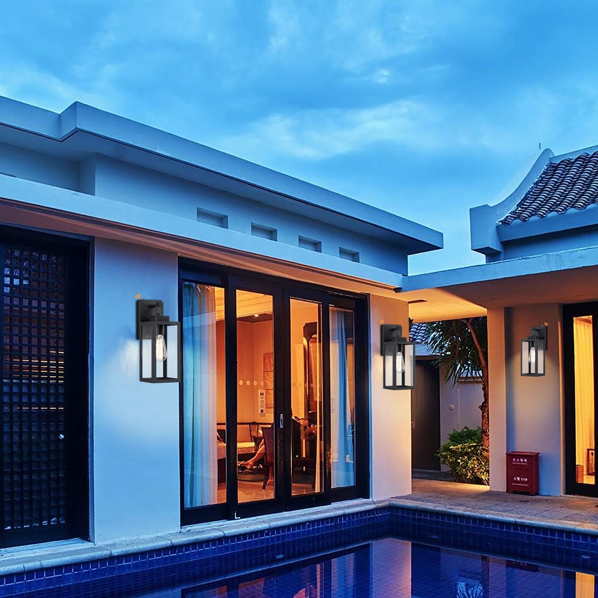 Lot de 4 appliques murales extérieures à 1 lumière, finition noir mat et abat-jour en verre transparent