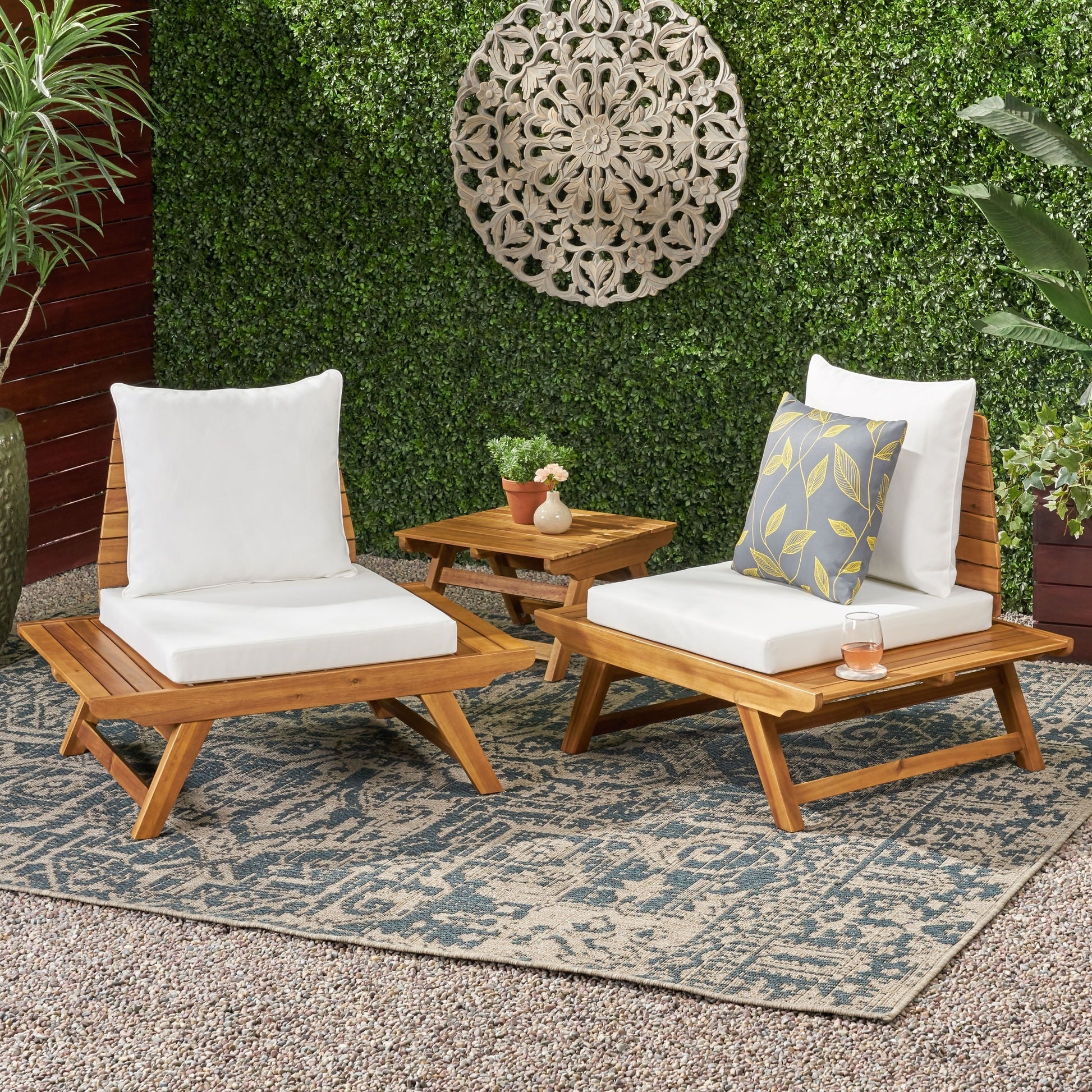 Profitez de votre terrasse extérieure avec cet ensemble de deux chaises en bois d'acacia de la collection Christopher Knight Home. La structure à lattes en bois d'acacia est dotée d'une assise extra-large qui se prolonge au-delà du coussin d'assise, formant ainsi une table intégrée pratique. Les coussins en polyester imperméable sont déhoussables pour un entretien facile.