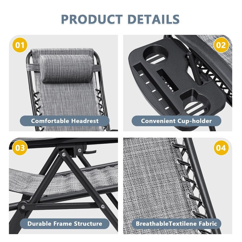 - Ce que nous offrons : Deux chaises de patio zéro gravité, une notice d’installation, notre service après-vente sans souci de 12 mois et un service client convivial.