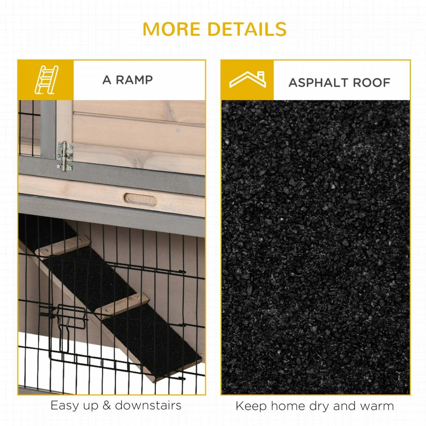 Offrez à votre ami à fourrure un espace de vie confortable avec Pawhut. Ce clapier de luxe pour lapins, avec sa combinaison unique de bois et de métal, est un mélange parfait de sécurité et de liberté pour vos amis à fourrure. Un enclos intérieur de style maison confortable et un vaste espace de cour avant offrent beaucoup de place pour se déplacer. Une rampe interne permet un accès rapide entre les deux étages. Une porte verrouillable facilite l'accès pour le nettoyage et les tâches de routine. Un tiroir coulissant intégré et un toit ouvrant pour un entretien facile.