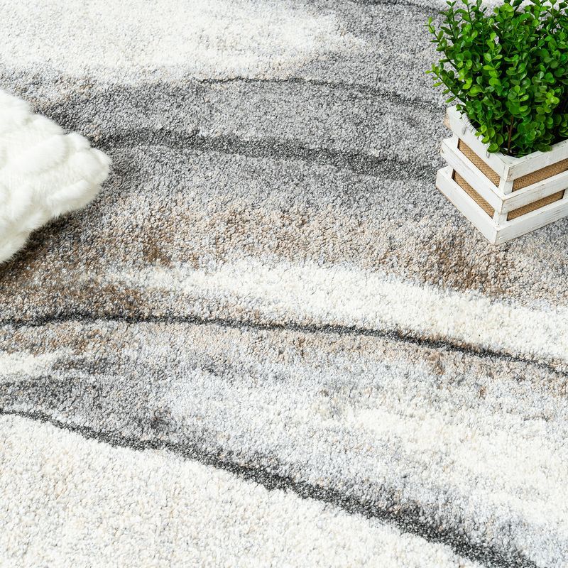 Ce magnifique tapis moderne présente un design abstrait courbé exquis et un mélange de couleurs gris, blanc cassé et marron.
