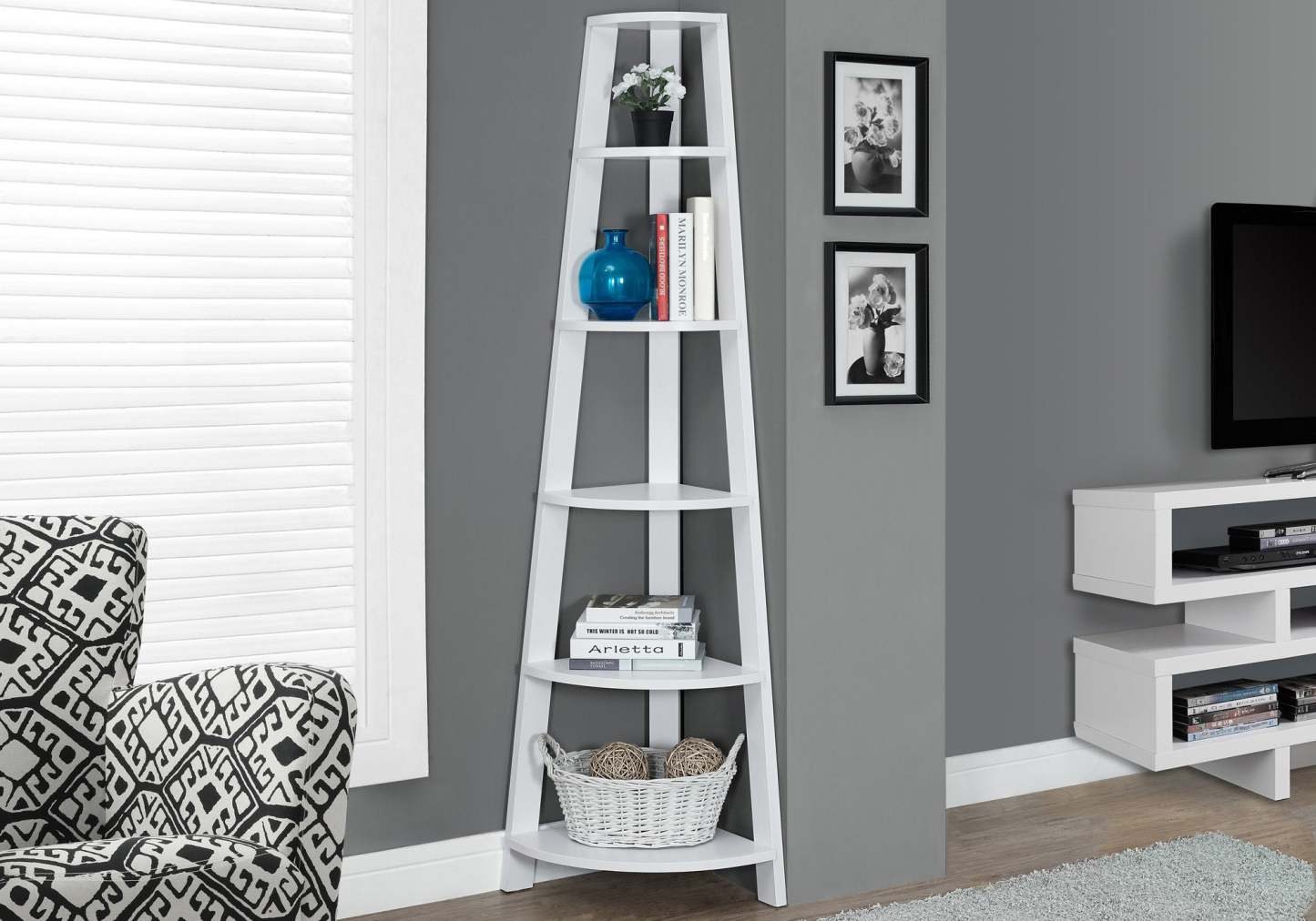 Montez facilement cette étagère et laissez-la faire son travail ! Regardez comme l'étagère s'intègre bien dans un coin de votre salon, bureau ou chambre, vous permettant d'exposer des livres et toutes sortes de décorations facilement. Profitez d'un endroit souvent difficile à aménager : le coin. Maximisez le rangement et l'affichage avec une pièce moderne qui vous aidera à utiliser tout l'espace disponible grâce à 5 étagères fixes de style plateau. Trois pieds en poutres robustes assurent l'intégrité de la structure de cette étagère d'angle en blanc. Du matériel anti-basculement est inclus pour une stabilité supplémentaire.