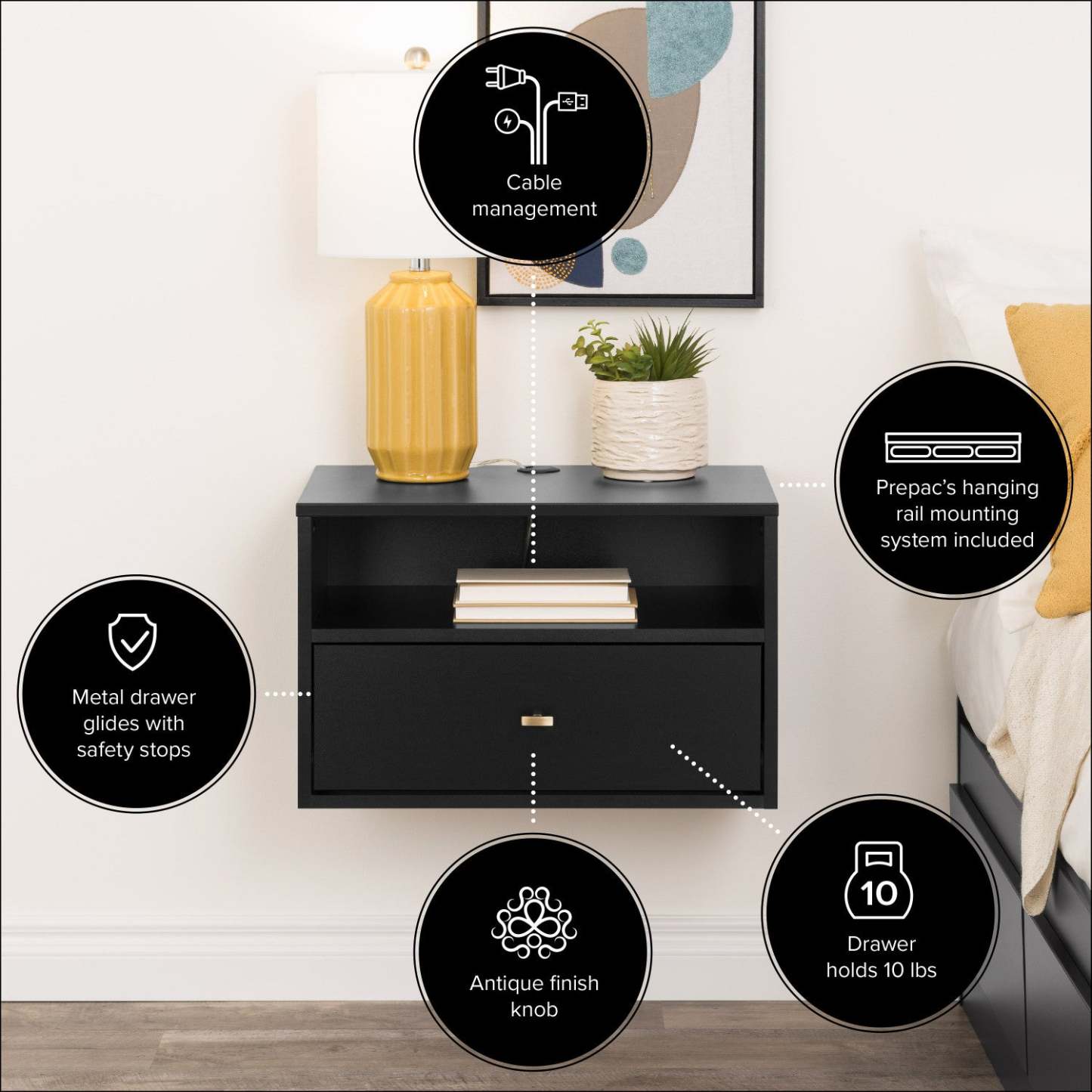 Cette élégante table de chevet suspendue est le complément idéal de votre chambre moderne. Dotée d'un tiroir et d'un compartiment ouvert, elle accueille tous vos essentiels de chevet, comme des livres, des magazines et des lunettes. Pour vos appareils électroniques, le plateau et le compartiment sont équipés d'ouvertures permettant une gestion aisée des câbles. Suspendue, elle s'installe à la hauteur souhaitée et optimise l'espace au sol. Le rail de fixation innovant de Prepac facilite son installation : il vous suffit de repérer les montants muraux.