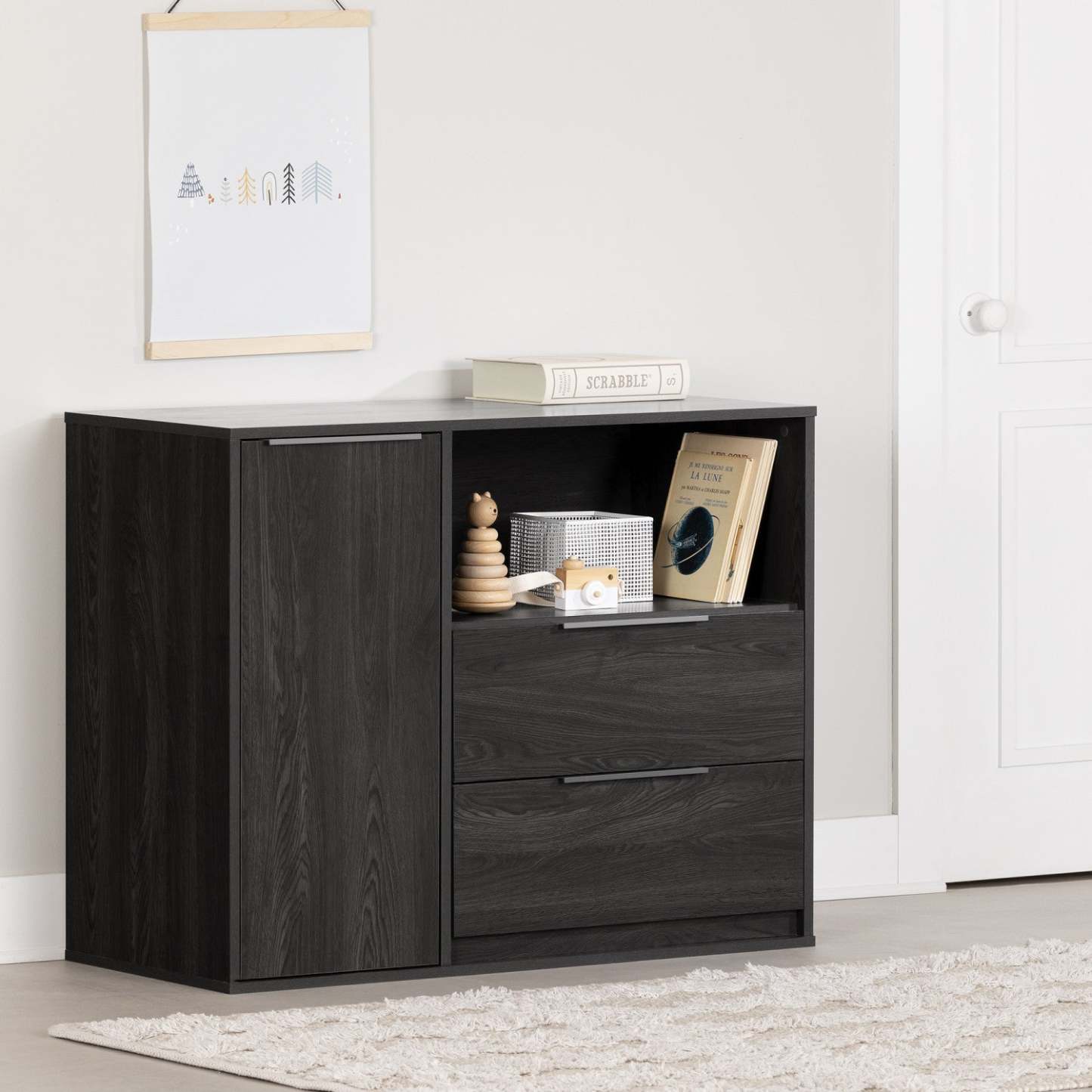 Vous avez un besoin urgent de rangement dans la chambre de votre enfant ? Nous avons exactement ce qu'il vous faut. Cette petite unité de rangement a un design original et bien pensé qui combine des espaces ouverts et fermés. Les deux tiroirs sur glissières métalliques et le cabinet, qui dispose de deux espaces de rangement divisés par une étagère réglable, peuvent être utilisés pour organiser des vêtements, des couvertures et même des jouets. L'espace ouvert est idéal pour accueillir les objets décoratifs préférés de votre petit trésor ou tout autre élément qui doit être à portée de main, comme des livres à lire.