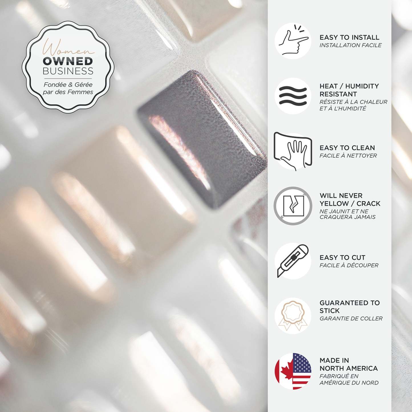 Les Smart Tiles sont robustes et résistants à la chaleur des plaques de cuisson. Ils sont également adaptés comme crédence dans les salles de bains (non adaptés à l'intérieur de la douche). Simplifiez votre vie avec ces carreaux muraux autocollants innovants spécialement conçus pour les zones de crédence de cuisine et de salle de bain. Fini les installations de carreaux en désordre, longues et stressantes avec du coulis ou de la colle. DIY sans effort, instructions faciles à suivre incluses. Installation propre et sans poussière. Les Smart Tiles sont une œuvre d'art. Une fois que les Smart Tiles ont complètement adhéré à la surface, après 48 heures, ils resteront en place sans se décoller ni se fissurer, aussi longtemps que vous en avez besoin.