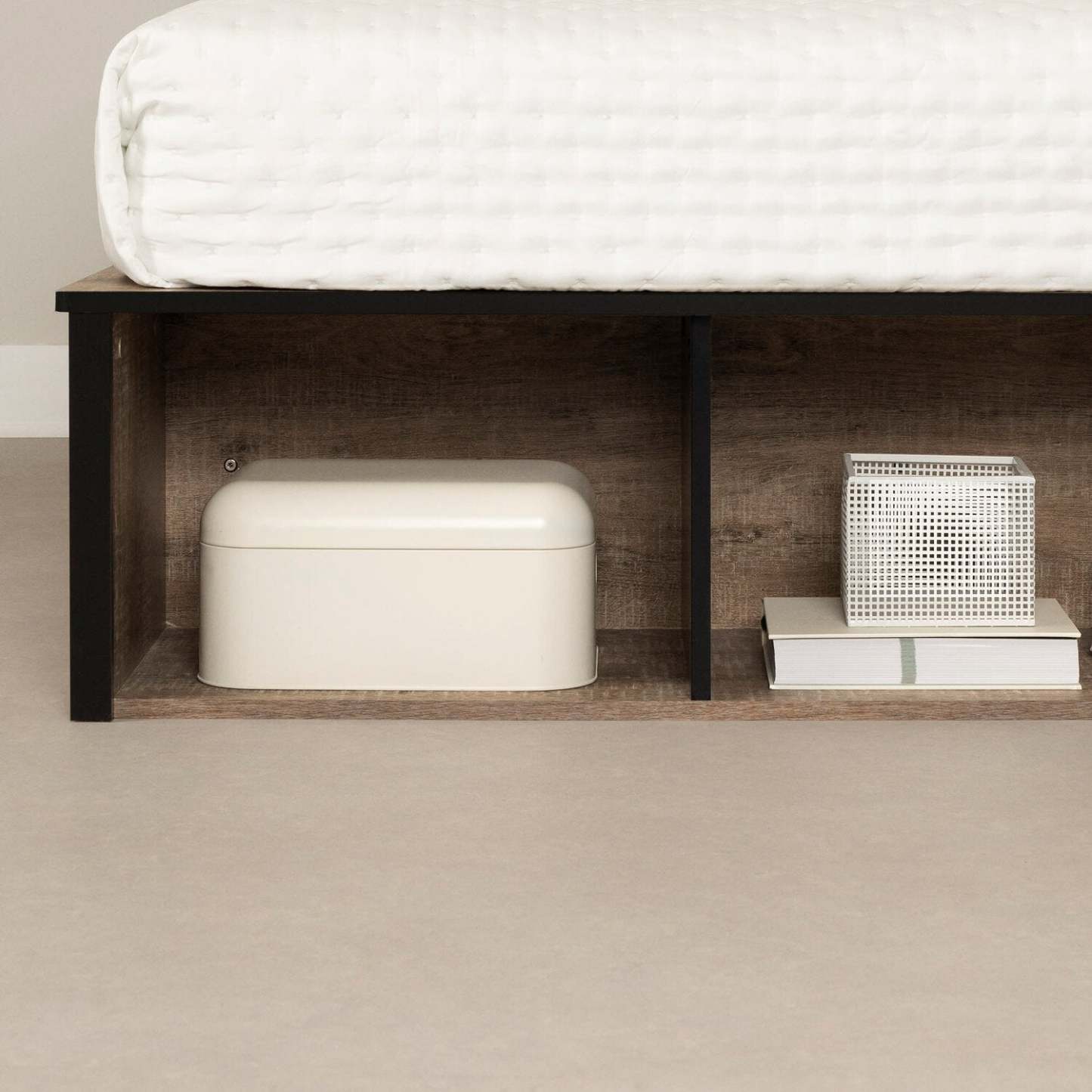 Lit plateforme Everley avec rangement et paniers intégrés, chêne patiné et noir mat - taille simple | Lit plateforme Everley avec rangement et paniers intégrés, chêne vieilli et noir mat - format lit simple