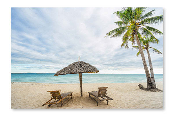 Deux chaises de plage, parasol et cocotier : cadre mural et panneau de tissu 28 x 42 po | Deux chaises de plage, parasol et cocotier 28 x 42 po : cadre d'art mural et panneau de tissu | D44G1U4O