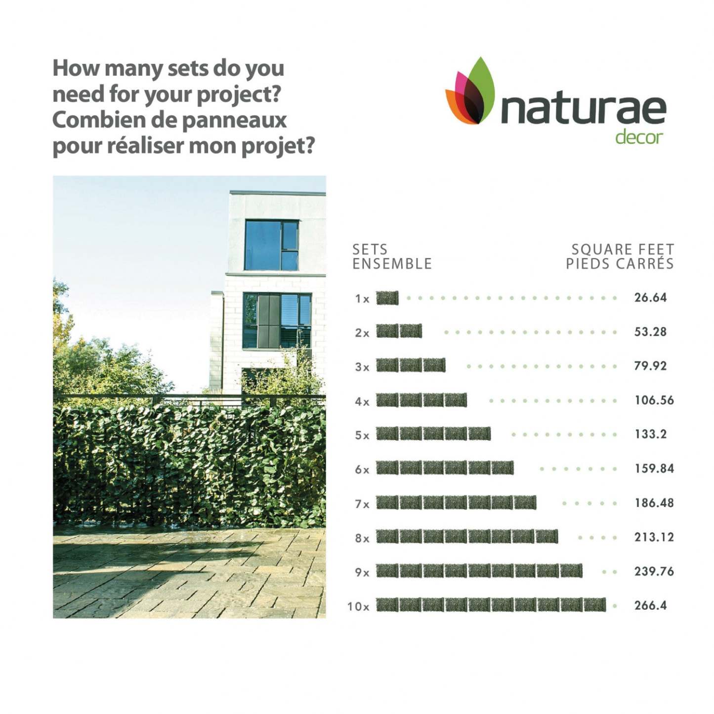 Les rouleaux de lierre artificiel Naturae Decor vous offrent l'intimité dont vous avez tant besoin dans votre espace préféré, tout en y ajoutant une touche de verdure apaisante. Fabriqués à partir de matériaux de haute qualité et garantissant une intimité optimale sans interstices, ces rouleaux de haie artificielle sont montés sur un filet en polyéthylène robuste et flexible et mesurent 101,6 cm x 243,8 cm. Faciles à installer, ils se déplient et s'assemblent sur pratiquement toutes les surfaces pour un effet homogène. Les feuilles sont découpées dans du polyester 100 % résistant aux intempéries et aux UV, assurant ainsi leur durabilité au fil des saisons. Le feuillage dense et réaliste du lierre artificiel crée de l'ombre tout en laissant circuler l'air. Une solution polyvalente pour réaménager et égayer n'importe quel espace. Transformez instantanément votre patio, terrasse, balcon, clôture ou jardin en un clin d'œil et sans effort. Avec un entretien minimal, vous aurez plus de temps pour vous détendre.