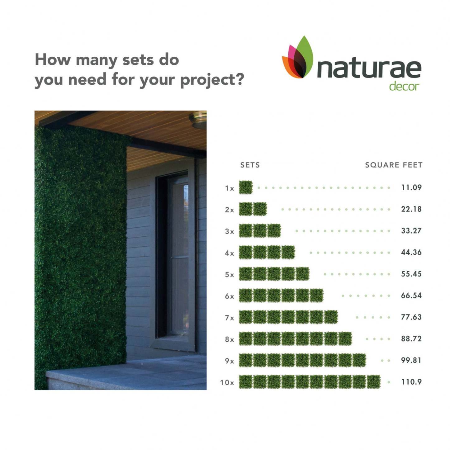 Les panneaux de haie Naturae Decor sont la solution idéale pour vos projets de bricolage. Faciles à découper pour s'adapter à tous les espaces, ils s'installent en toute sécurité grâce aux fixations incluses. Pliables et enroulables, ces éléments de verdure artificielle s'adaptent à toutes les formes et surfaces, sans laisser d'espace. Parfaits pour créer de l'intimité sur votre terrasse, patio ou balcon. Laissez libre cours à votre créativité et réalisez une décoration murale tendance, un mur végétal artificiel ou un décor impressionnant pour une fête ou une séance photo. Fabriqués en polyéthylène haute qualité résistant aux UV, ces panneaux sont conçus pour durer. Embellissez instantanément votre maison avec nos styles naturels, sans les contraintes de temps et d'entretien des haies et des plantes grimpantes. Une solution économique pour embellir votre espace préféré, intérieur ou extérieur. Chaque paquet contient quatre panneaux et les fixations nécessaires à une installation facile. Bénéficiant d'une garantie de 2 ans, nos panneaux de 50 x 50 cm avec grille de support intégrée sont durables et conçus pour résister aux intempéries.