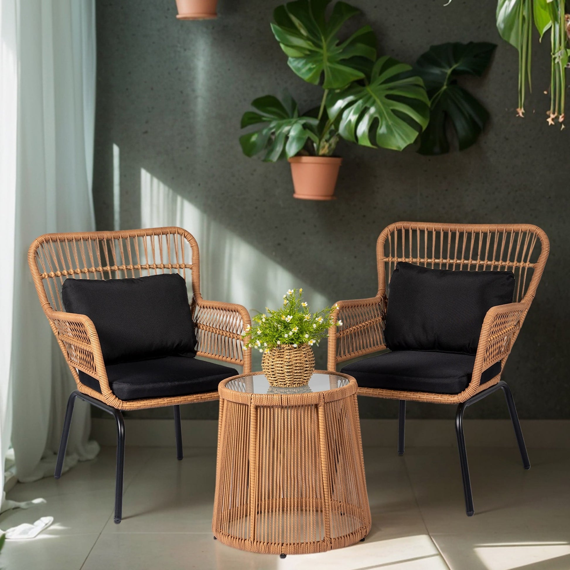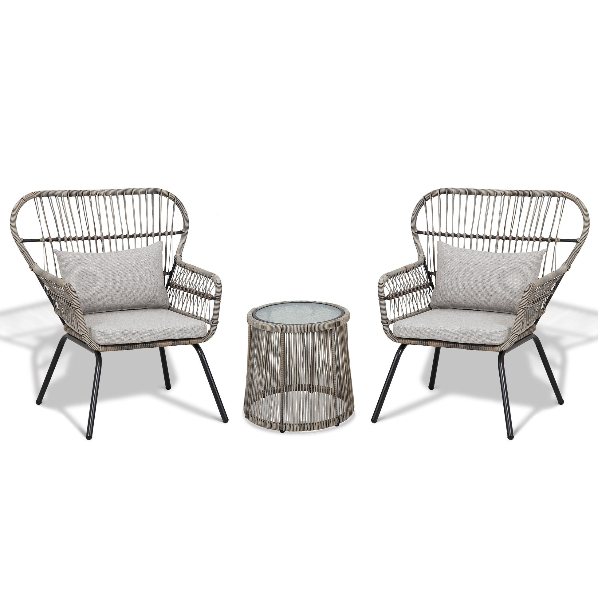 Ensemble de bistrot d'extérieur 3 pièces en osier, mobilier de jardin en rotin toutes saisons, chaises de patio avec coussins