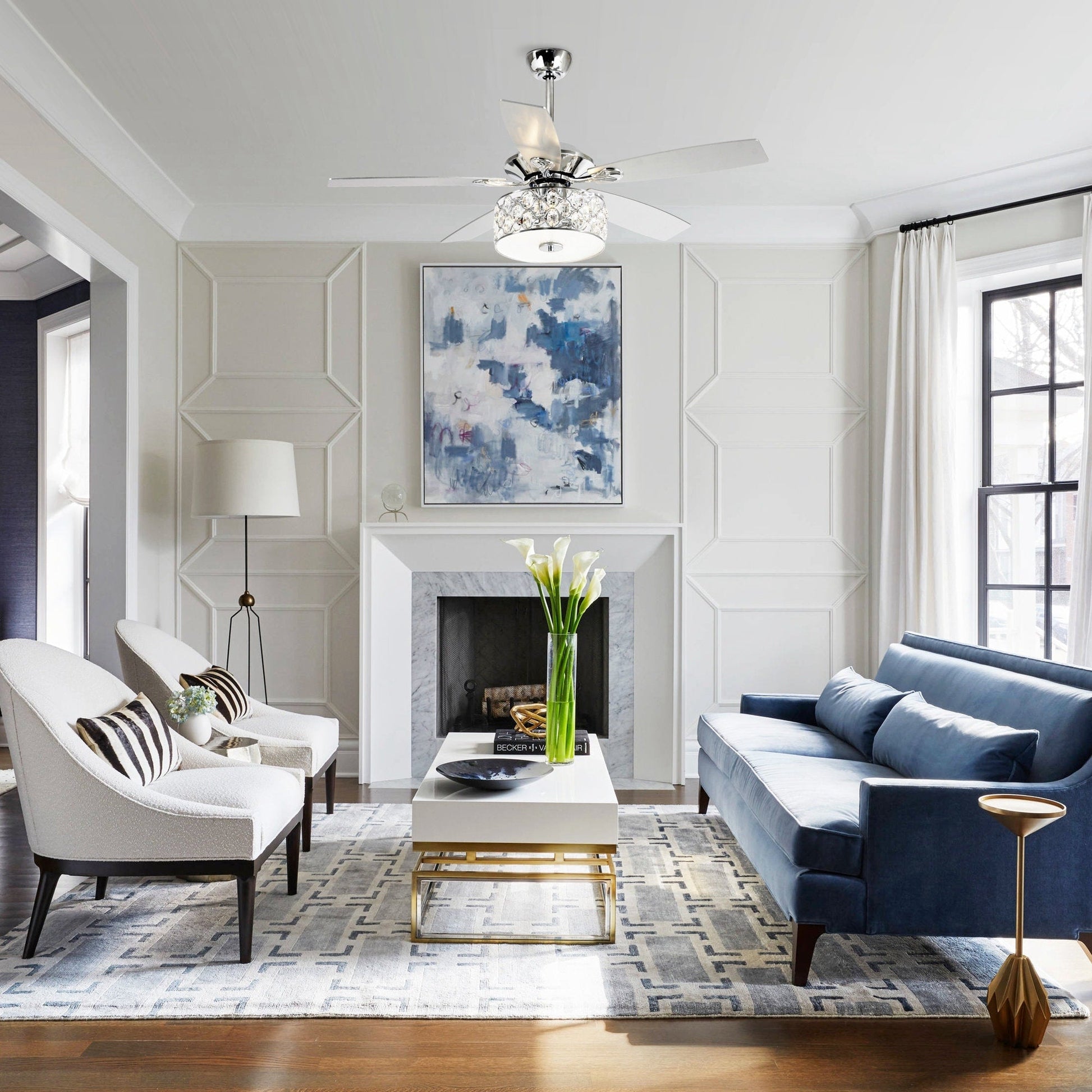 Apportez une touche de modernité et d'élégance à votre intérieur avec ce ventilateur de plafond de 132 cm (52 pouces) à quatre lumières et à cristaux, doté d'une télécommande. Sa structure en métal chromé et ses pales en bois argenté lui confèrent un style épuré et contemporain, idéal pour toutes les pièces de votre maison. Profitez des avantages d'un moteur réversible à trois vitesses, parfait pour l'hiver et les économies d'énergie. La télécommande vous permet d'allumer et d'éteindre facilement la lumière et de régler la vitesse du ventilateur selon vos préférences.