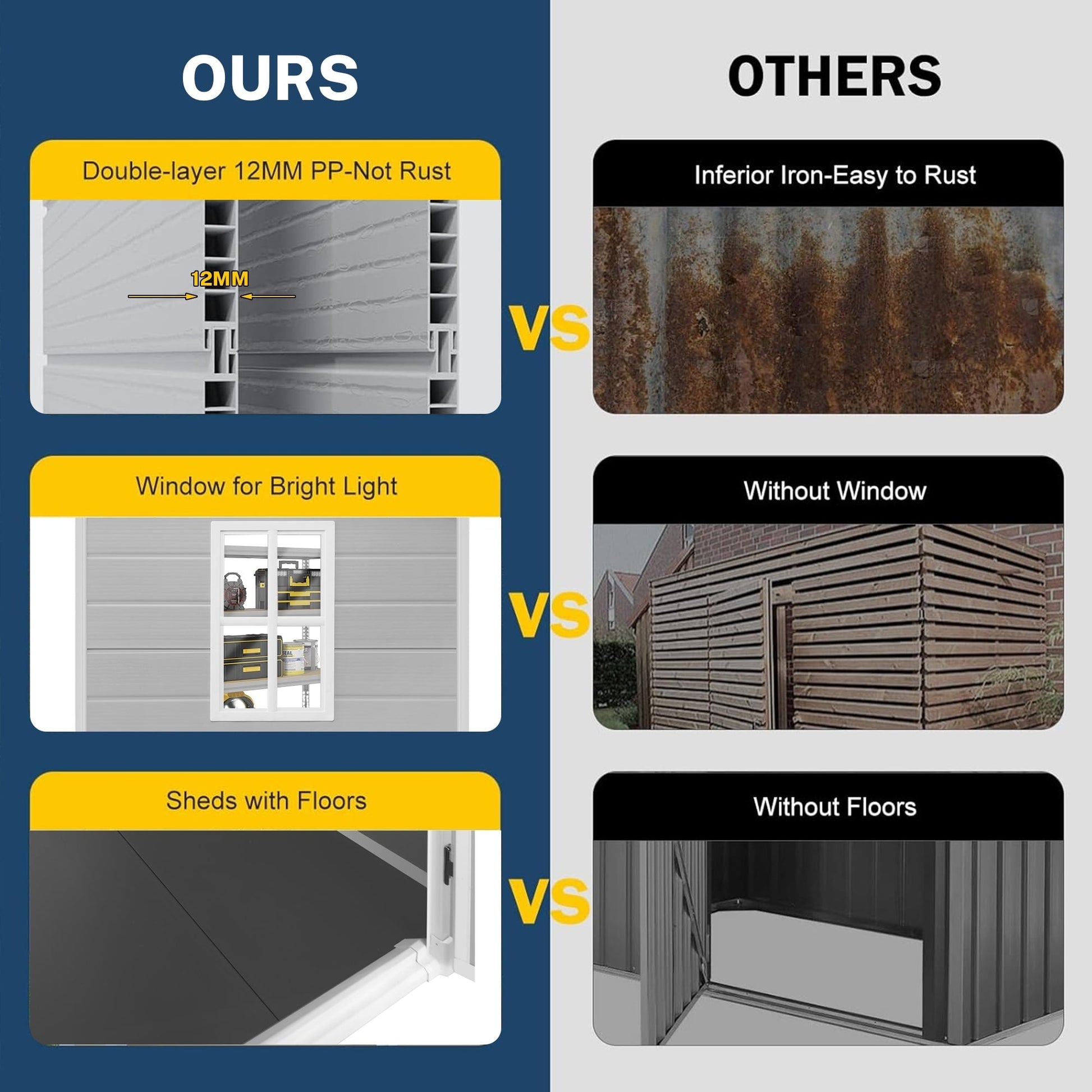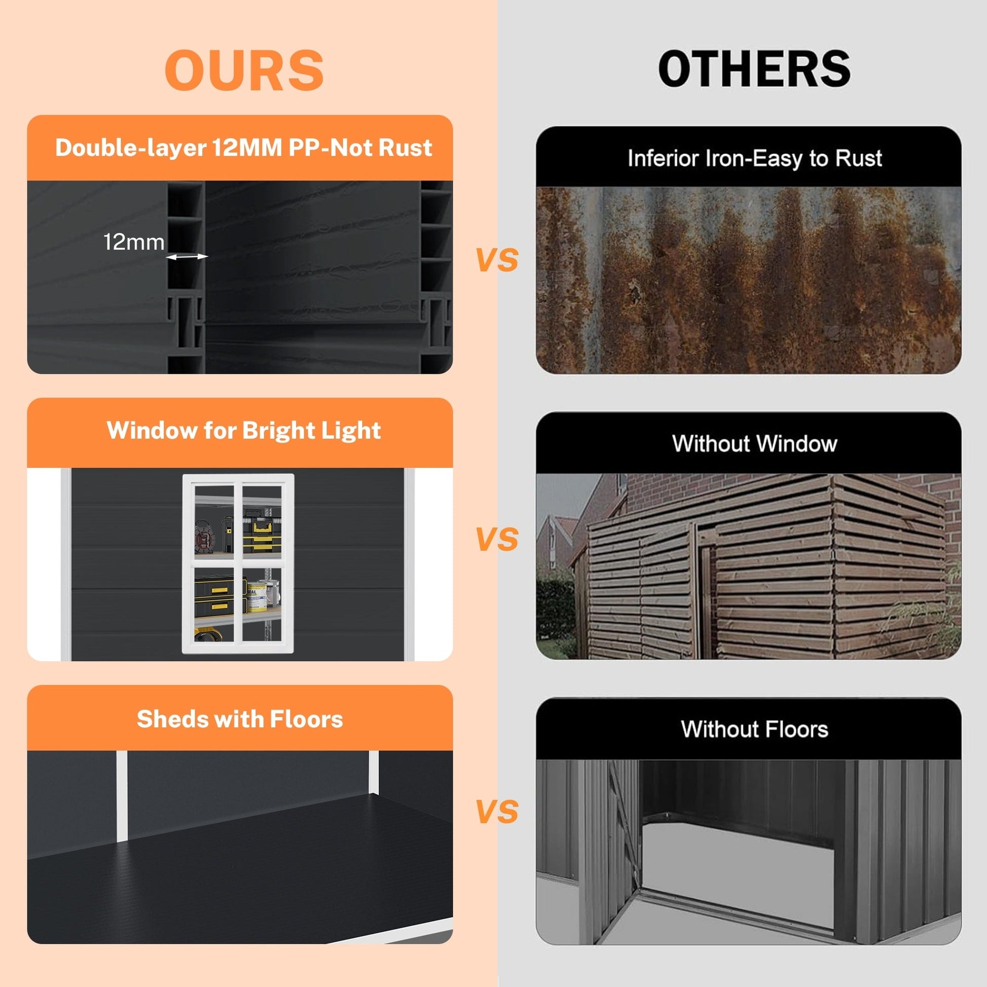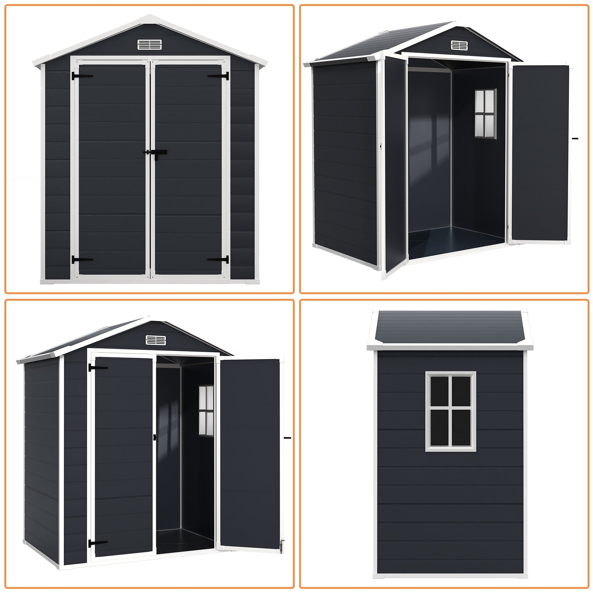 Abri de jardin en résine plastique tout temps avec plancher, dimensions : 1,83 m x 1,22 m / 1,83 m x 2,44 m / 2,44 m x 1,83 m / 2,44 m x 3,05 m.