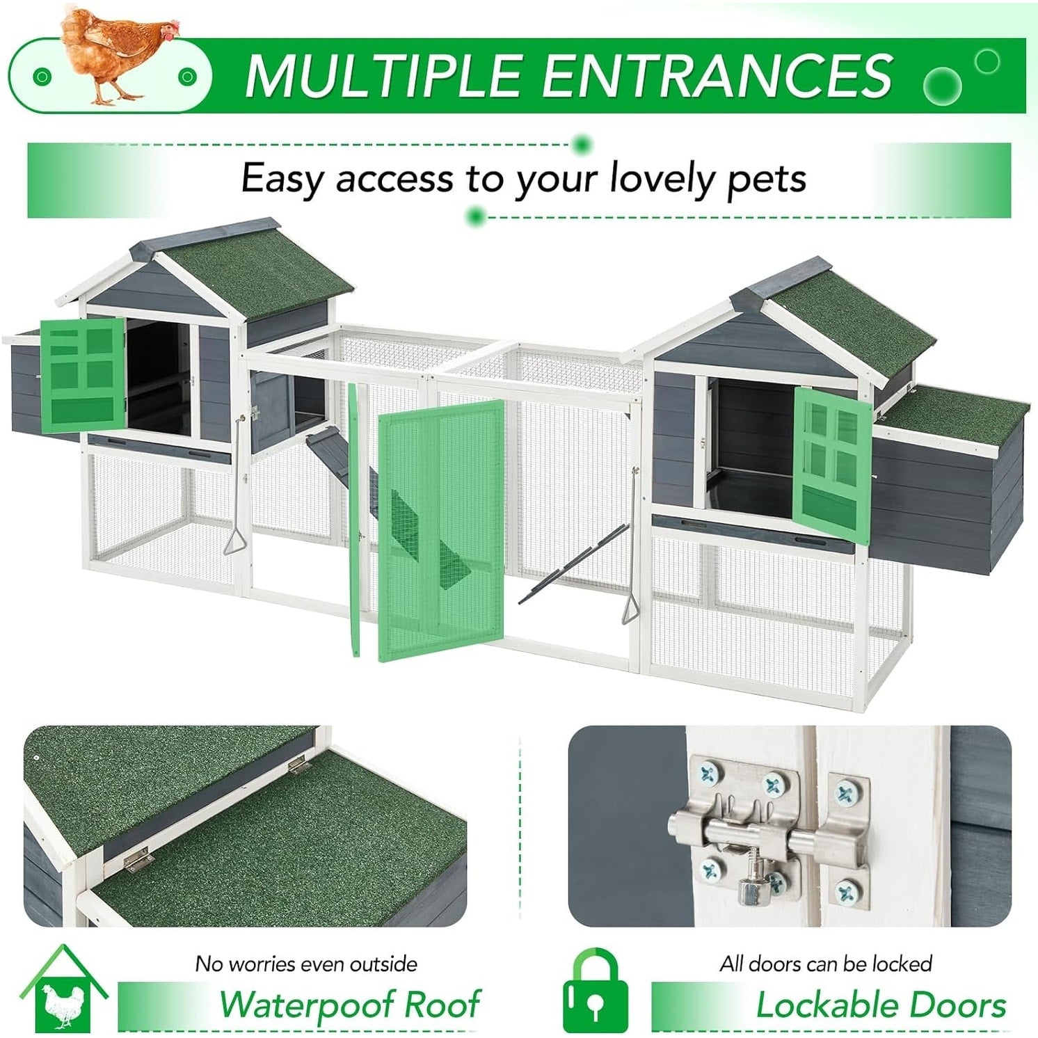 - Plateau amovible et nichoir : la cage pour animaux est livrée avec 2 grands nichoirs pour ramasser les œufs et 2 plateaux amovibles pour garder l’intérieur propre et rangé, ainsi que des perchoirs pour que les poules puissent se percher pendant la journée ou la nuit.