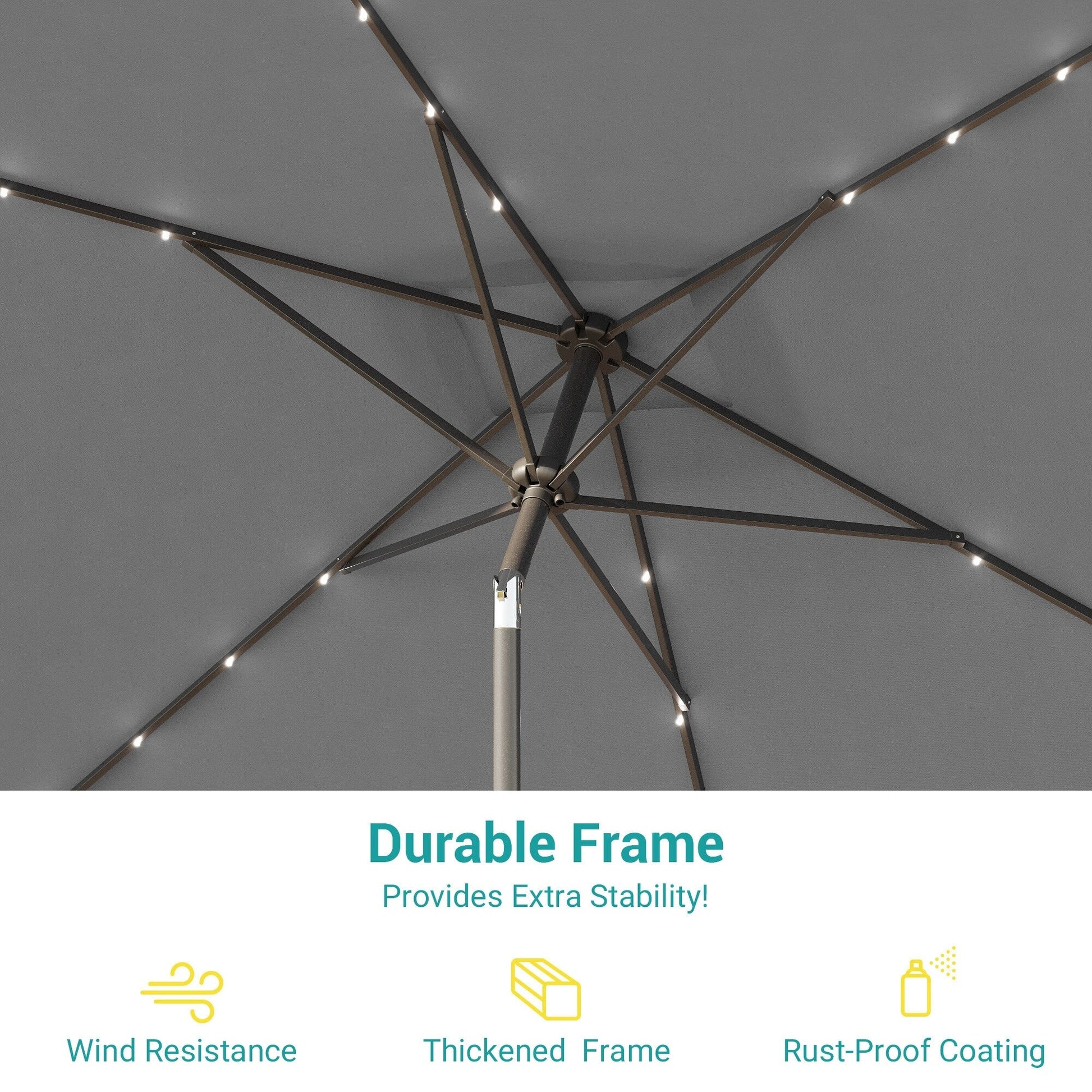 - Ce parasol est soutenu par six baleines en acier thermolaqué et un mât.