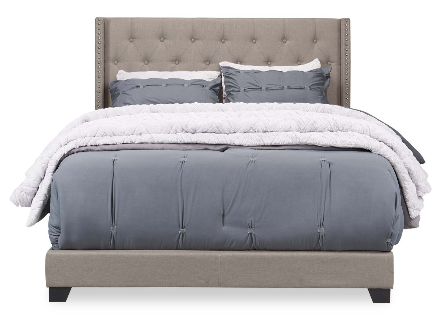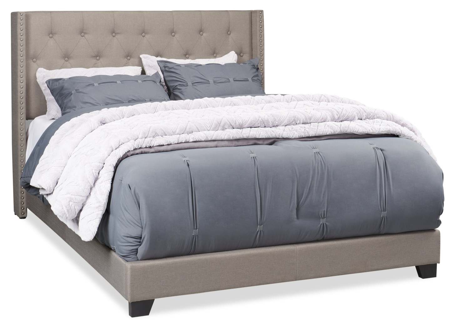 Lit à oreilles rembourré Brady en tissu gris clair avec motif clouté, capitonné avec boutons - Queen Size | Lit rembourré à oreilles Brady en tissu gris clair avec clous décoratifs et capitonnage à boutons - format grand lit