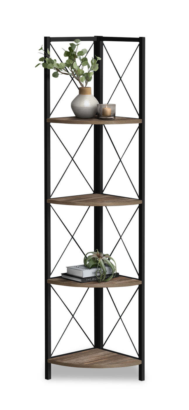 Parfaite pour les cadres photo, les plantes, d'autres objets décoratifs et même les accessoires de cuisine, cette bibliothèque d'angle de style transitionnel rehaussera votre décoration. Comprenant 4 étagères d'affichage en bois récupéré de couleur marron moyen, cette unité d'affichage d'angle dispose d'un cadre en métal noir à trois pieds et d'un design en X pour ajouter une touche moderne où que vous choisissez de la placer. Cette bibliothèque d'angle est sûre d'impressionner. Un assemblage est requis.