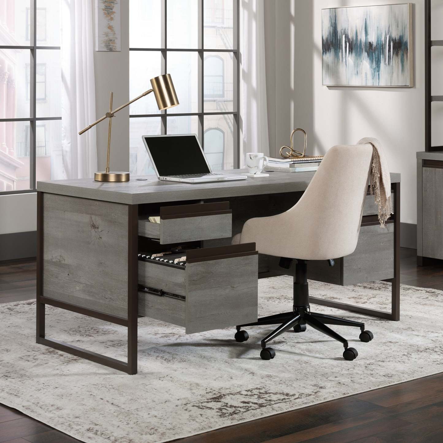 Faites une impression durable dans votre bureau avec ce bureau exécutif Manhattan Gate. Ce meuble dispose d'une surface spacieuse avec des bords en thermoplastique de haute qualité résistants aux chocs et offre de la place pour le travail et l'affichage. Les tiroirs supérieurs gardent les essentiels de bureau à portée de main, tandis que les tiroirs inférieurs contiennent des dossiers suspendus au format lettre ou légal pour une organisation maximale de vos documents. De plus, le tiroir de fichier gauche est équipé d'un verrou pour garder vos papiers importants en sécurité. Fini dans un ton gris élégant avec un cadre en métal revêtu de poudre, ce bureau améliore votre bureau avec un design simple mais élégant.