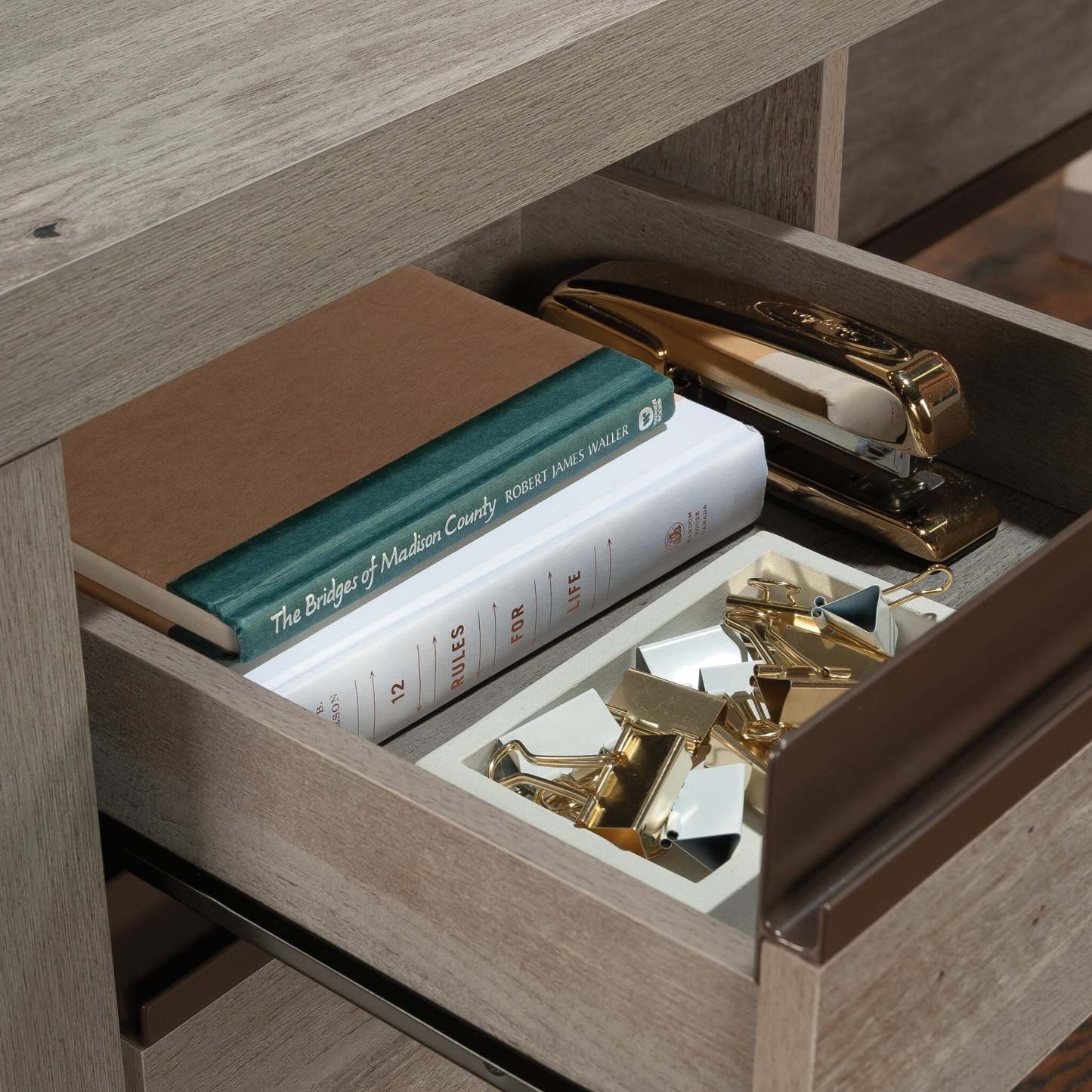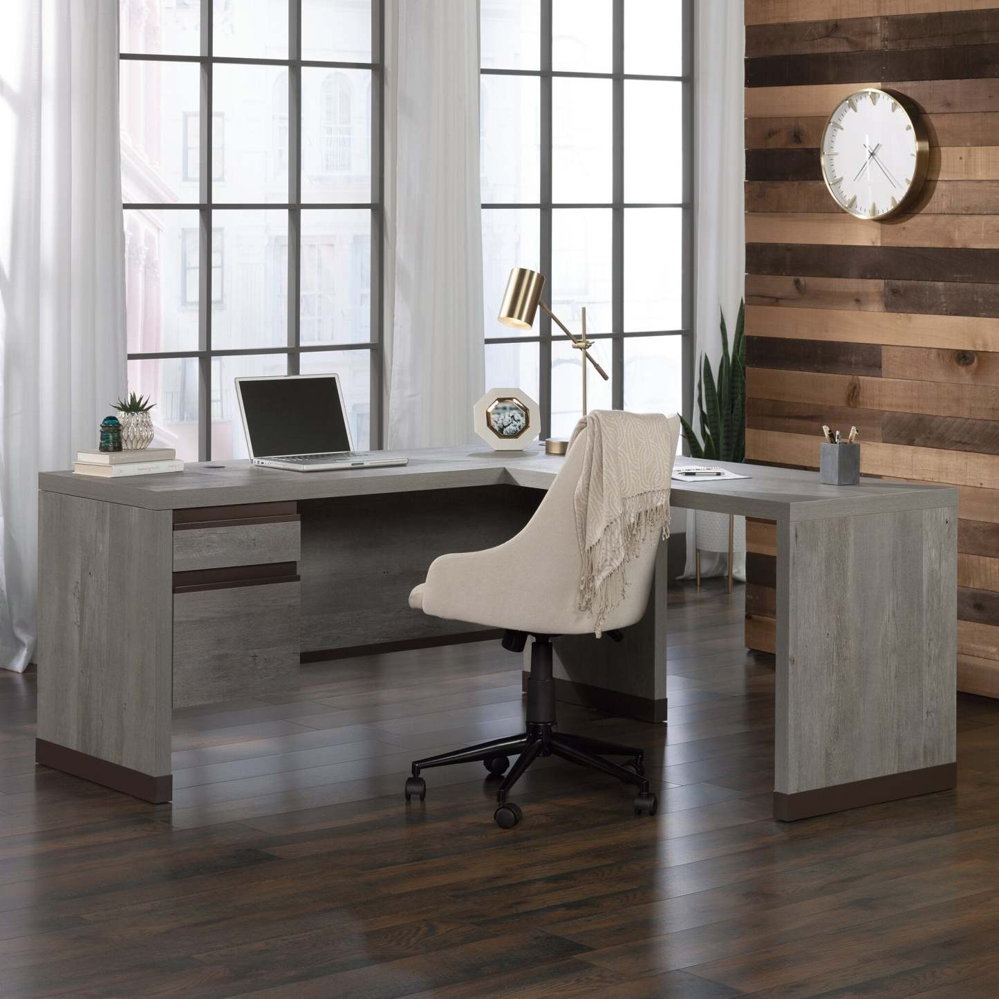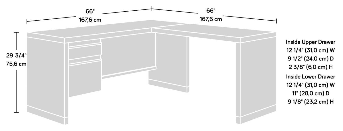 Faites une impression durable dans votre bureau avec ce bureau en L Manhattan Gate. Ce meuble dispose d'une surface spacieuse idéale pour un ordinateur de bureau ou portable, des livres et des classeurs, ainsi qu'une lampe et d'autres décorations d'intérieur. Deux tiroirs gardent les essentiels de bureau à portée de main, tandis que le tiroir du bas contient des dossiers suspendus au format lettre pour une organisation maximale de vos documents. De plus, le tiroir de fichiers est équipé d'un verrou pour garder vos papiers importants en sécurité. Fini dans une teinte grise élégante avec un cadre en métal revêtu de poudre, ce bureau améliore votre bureau avec un design simple mais élégant.