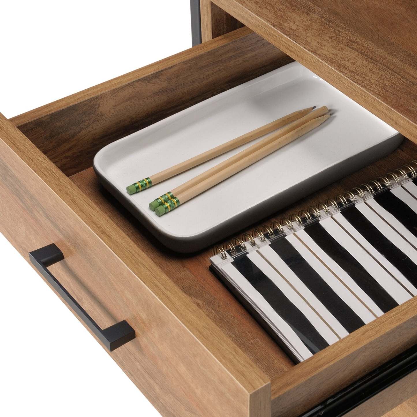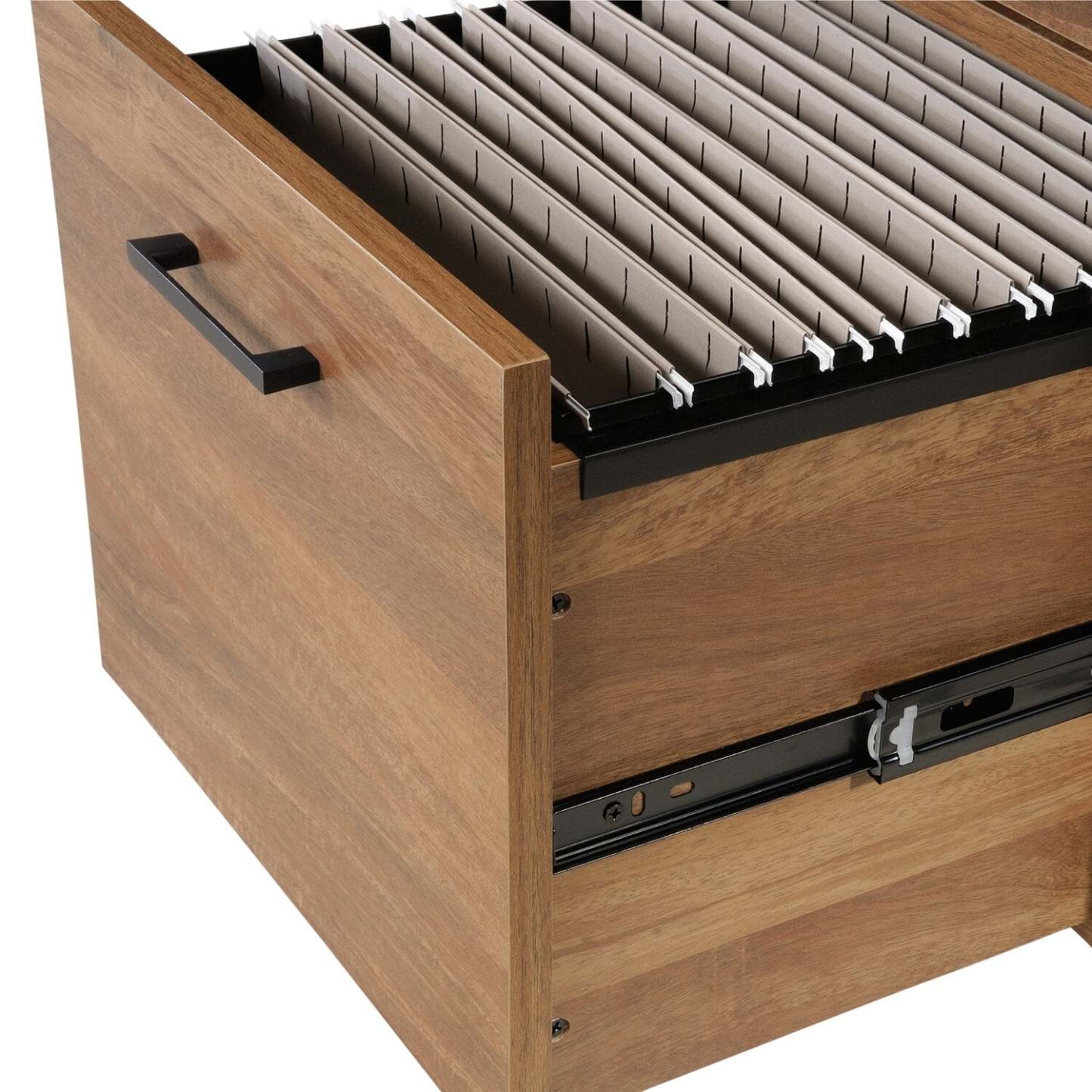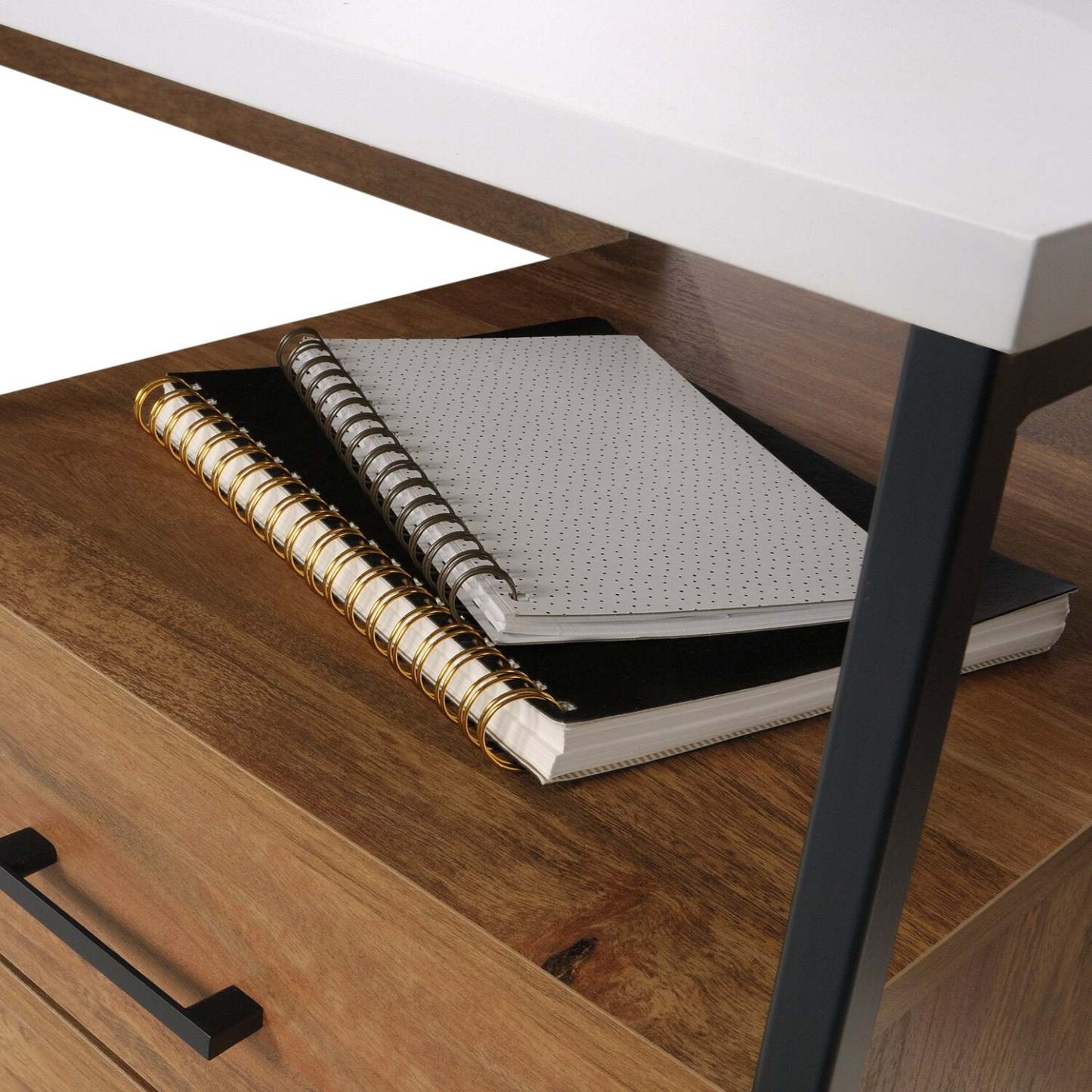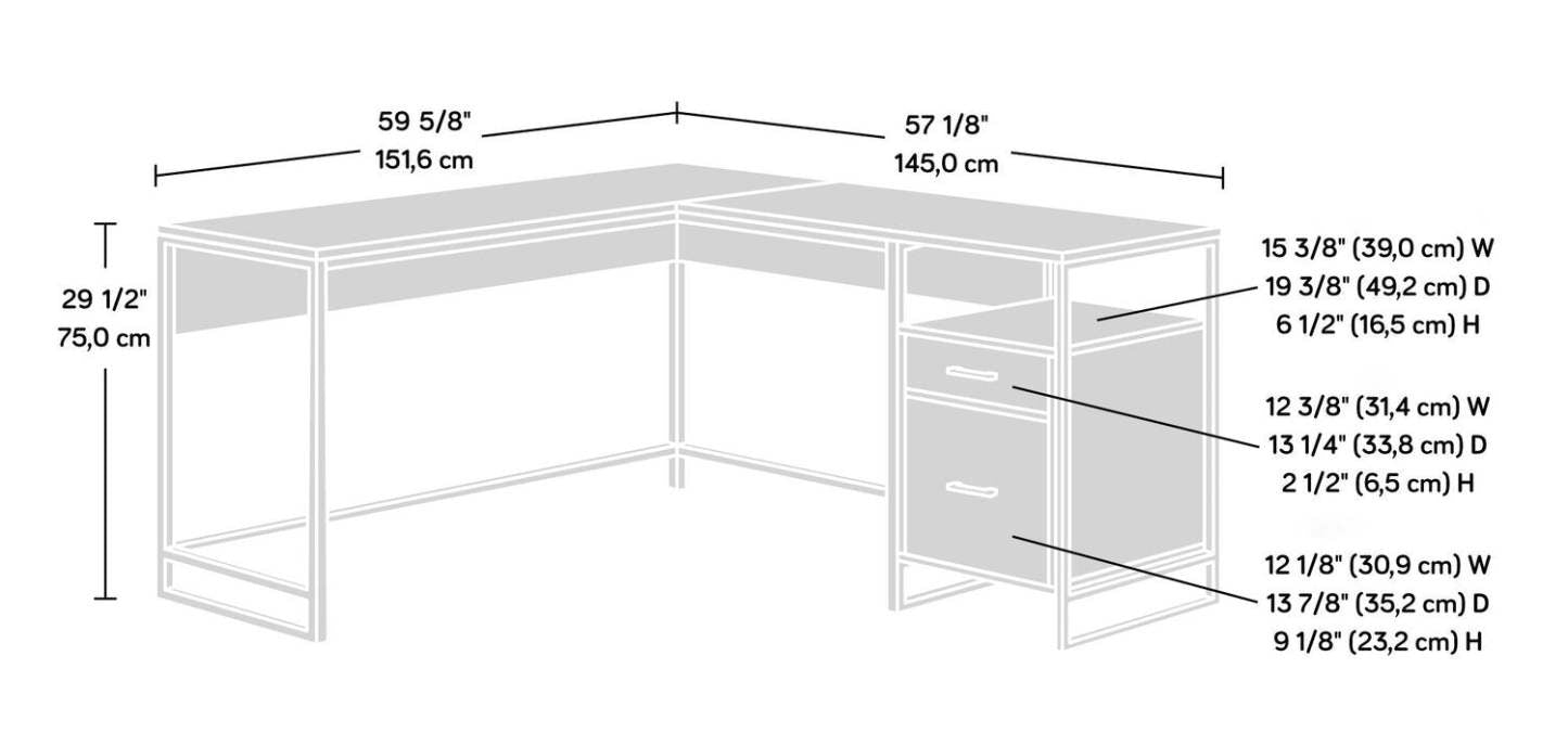 Mettez à jour l'apparence de votre espace de bureau avec le design mid-century de ce bureau en L Taryn. Cette unité offre une surface de bureau spacieuse avec suffisamment d'espace pour tout ce dont vous avez besoin pour travailler. Le tiroir de fichiers inférieur avec des glissières à extension complète organise les fichiers suspendus au format lettre, et le tiroir plus petit au-dessus peut contenir des stylos, une agrafeuse et plus encore. De plus, l'espace de rangement ouvert permet encore plus de place et un accès facile aux classeurs de travail et aux fournitures diverses. Ce bureau en L est fini dans un brun clair avec un plateau de bureau blanc complémentaire pour apporter du style à votre travail.