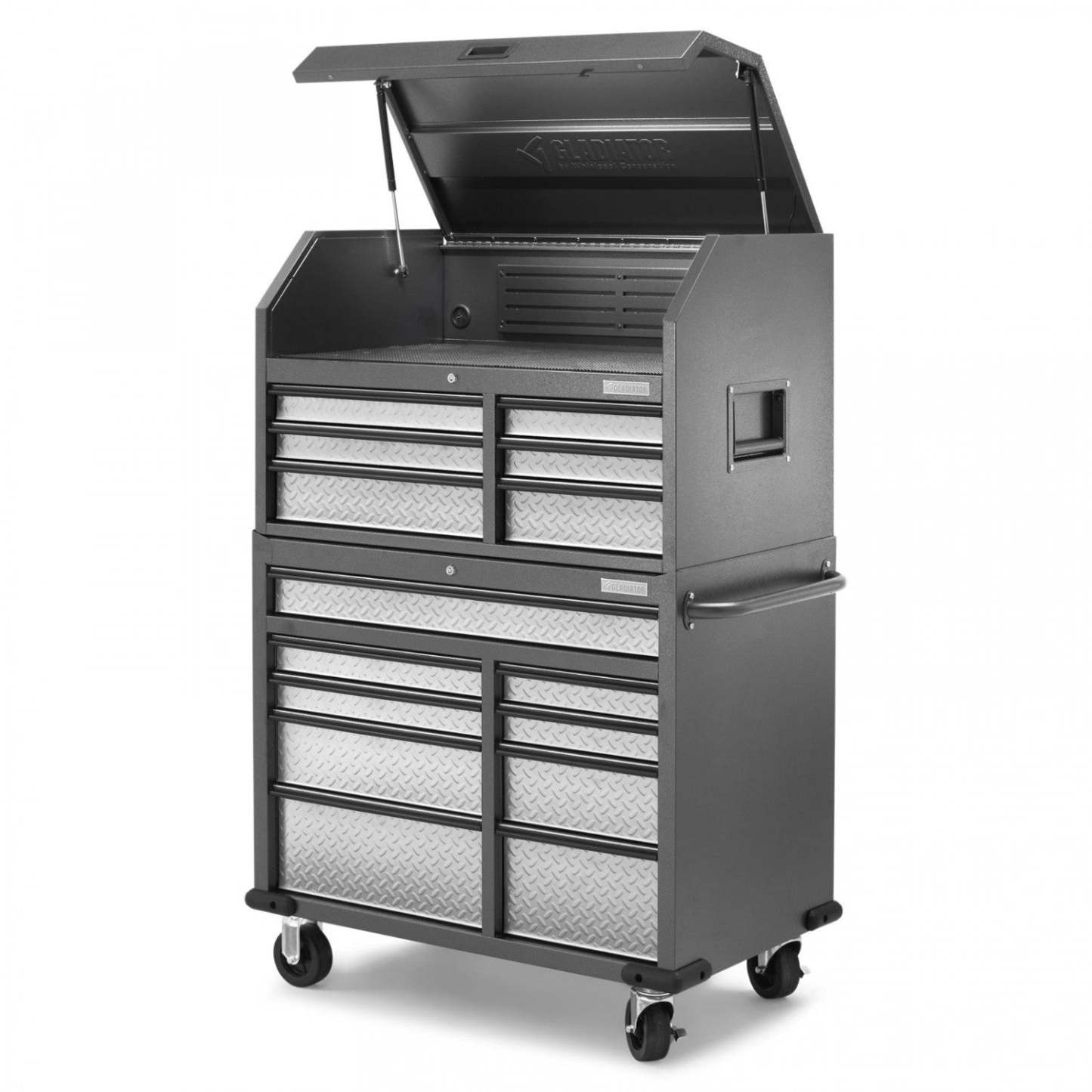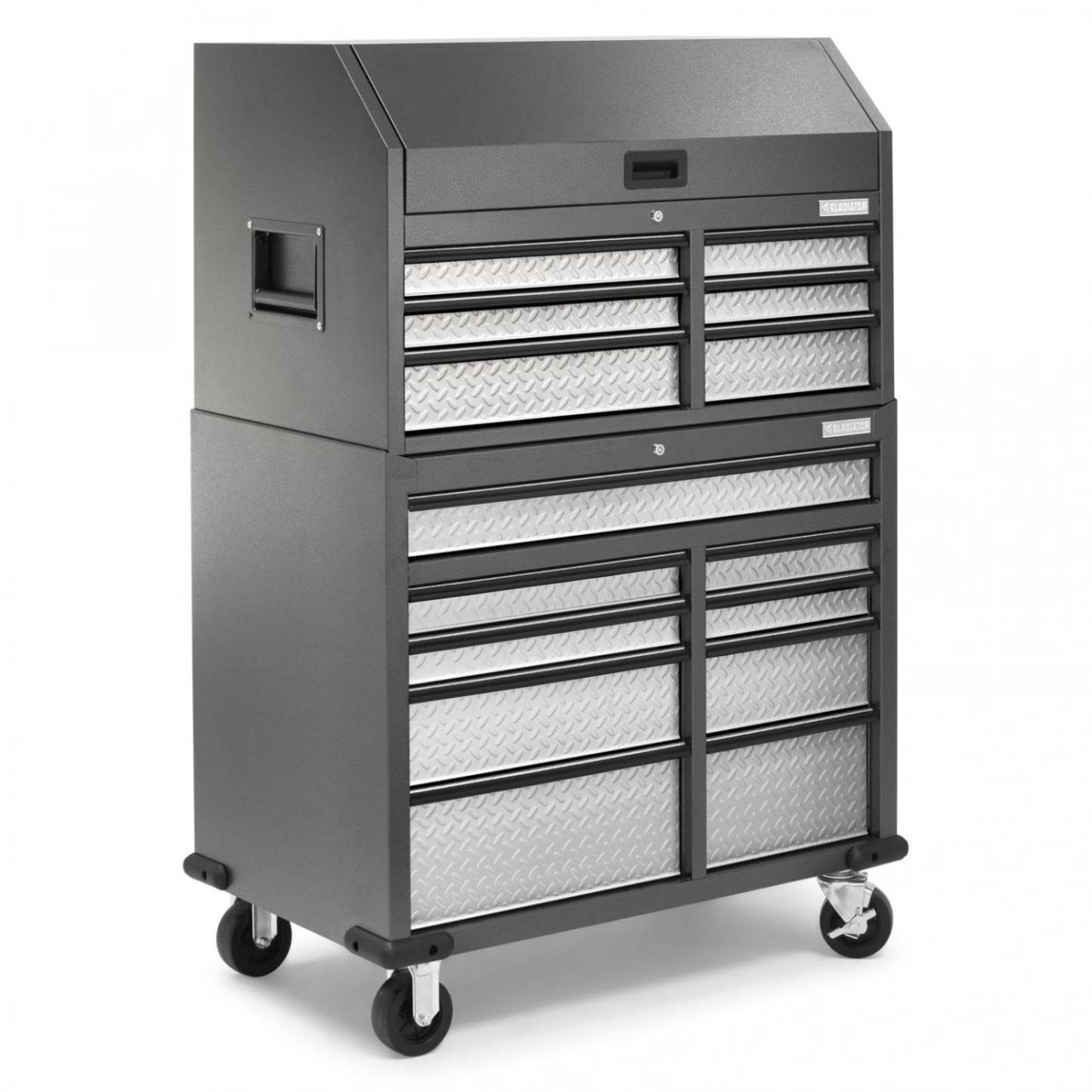 Élevez le stockage d'outils à un niveau supérieur avec le Gladiator® 41 15 Drawer Cabinet Chest Combo. Ce coffre à outils robuste est fabriqué en acier soudé et peut supporter jusqu'à 1500 lbs : une force suffisante pour gérer votre équipement le plus lourd. Chacun des 15 tiroirs à fermeture douce peut supporter jusqu'à 100 lbs chacun et dispose de doublures rembourrées, préservant l'intégrité de vos outils et gardant vos tiroirs sans rayures. 5 roulettes robustes avec des mécanismes de verrouillage et de déverrouillage faciles sont conçues pour une maniabilité aisée sur des surfaces inégales, vous permettant de toujours avoir votre coffre à outils à portée de main, tandis que l'alimentation intégrée, avec des ports USB, garde vos appareils et outils chargés pour que vous puissiez continuer à travailler. Le 41 15 Drawer Cabinet Chest Combo est couvert par la garantie à vie limitée de Gladiator, vous pouvez donc avoir l'assurance qu'il résistera à une vie d'usure.