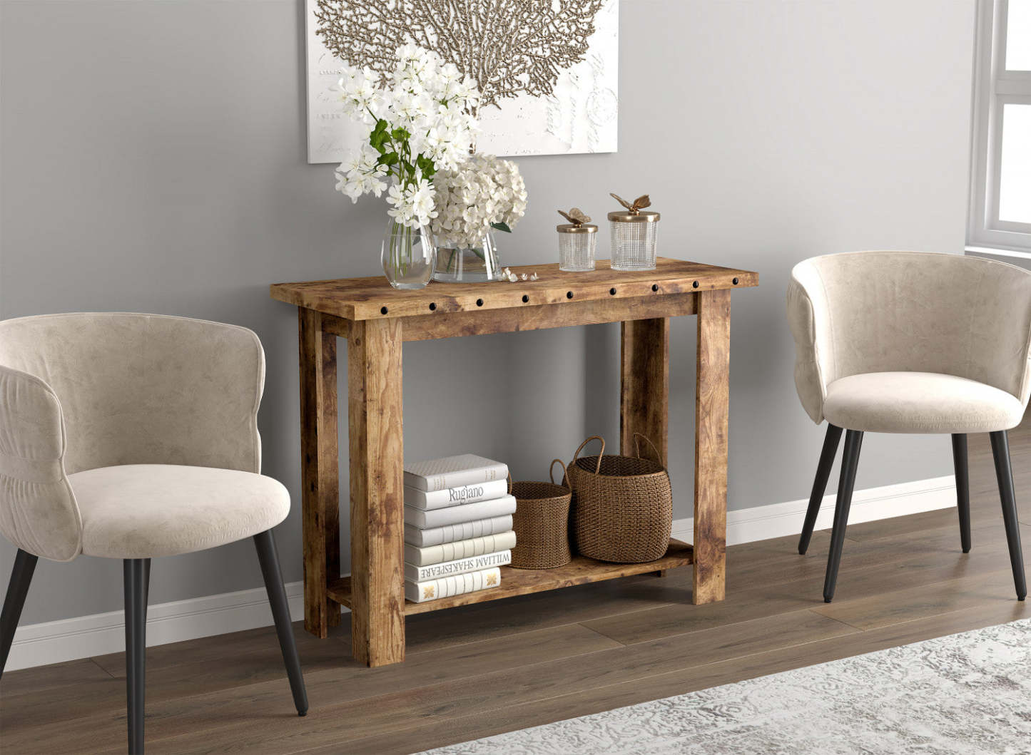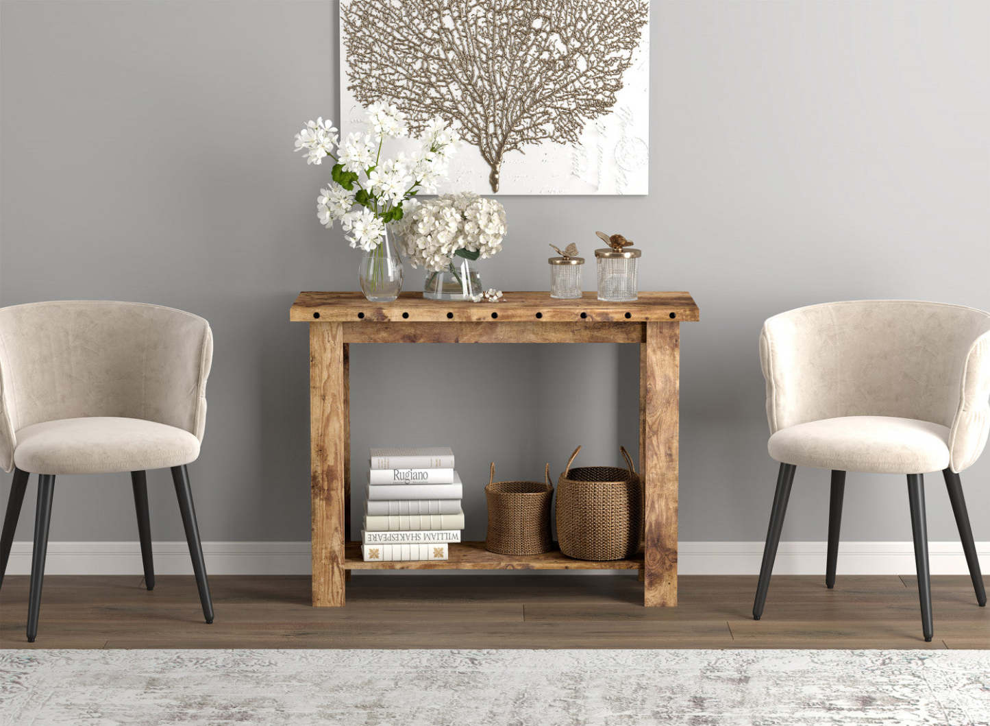 Apportez style, polyvalence et charme dans votre maison avec cette table console de 39' magnifiquement conçue, dotée d'une étagère ouverte unique. Parfaitement adaptée aux entrées, couloirs, salons, chambres ou bureaux, cette table est faite pour compléter n'importe quel décor tout en offrant des options de rangement et d'affichage pratiques. Son profil moderne et épuré s'intègre sans effort dans les petits espaces, ajoutant juste la bonne touche d'élégance sans surcharger la pièce. Utilisez-la pour organiser vos essentiels quotidiens—clés, courrier, chargeurs—ou pour afficher votre décoration préférée, des plantes ou des livres. L'étagère inférieure offre un espace supplémentaire pour garder les choses en ordre, la rendant aussi fonctionnelle que stylée. Qu'elle soit utilisée comme table d'appoint, station de bar, support de maquillage ou coin café confortable, cette pièce s'adapte à vos besoins avec aisance. Conçue pour un usage quotidien, elle allie durabilité et design intemporel. Facile à assembler et infiniment utile, c'est l'accent parfait pour n'importe quelle pièce de votre maison. Laissez-la apporter beauté et équilibre à votre espace, un détail à la fois.