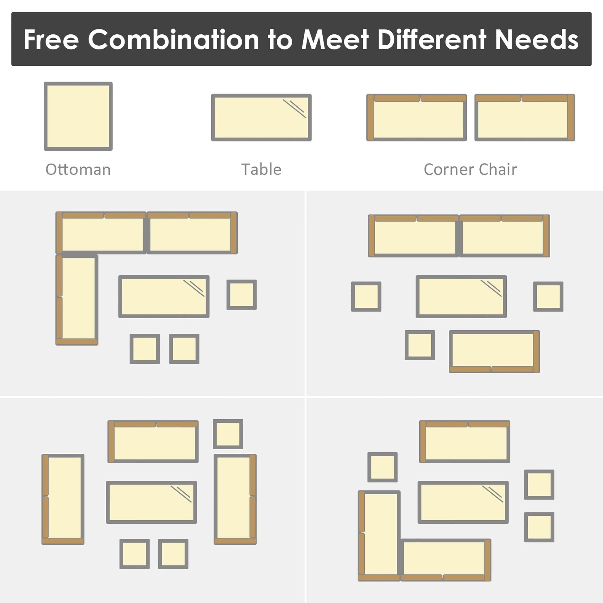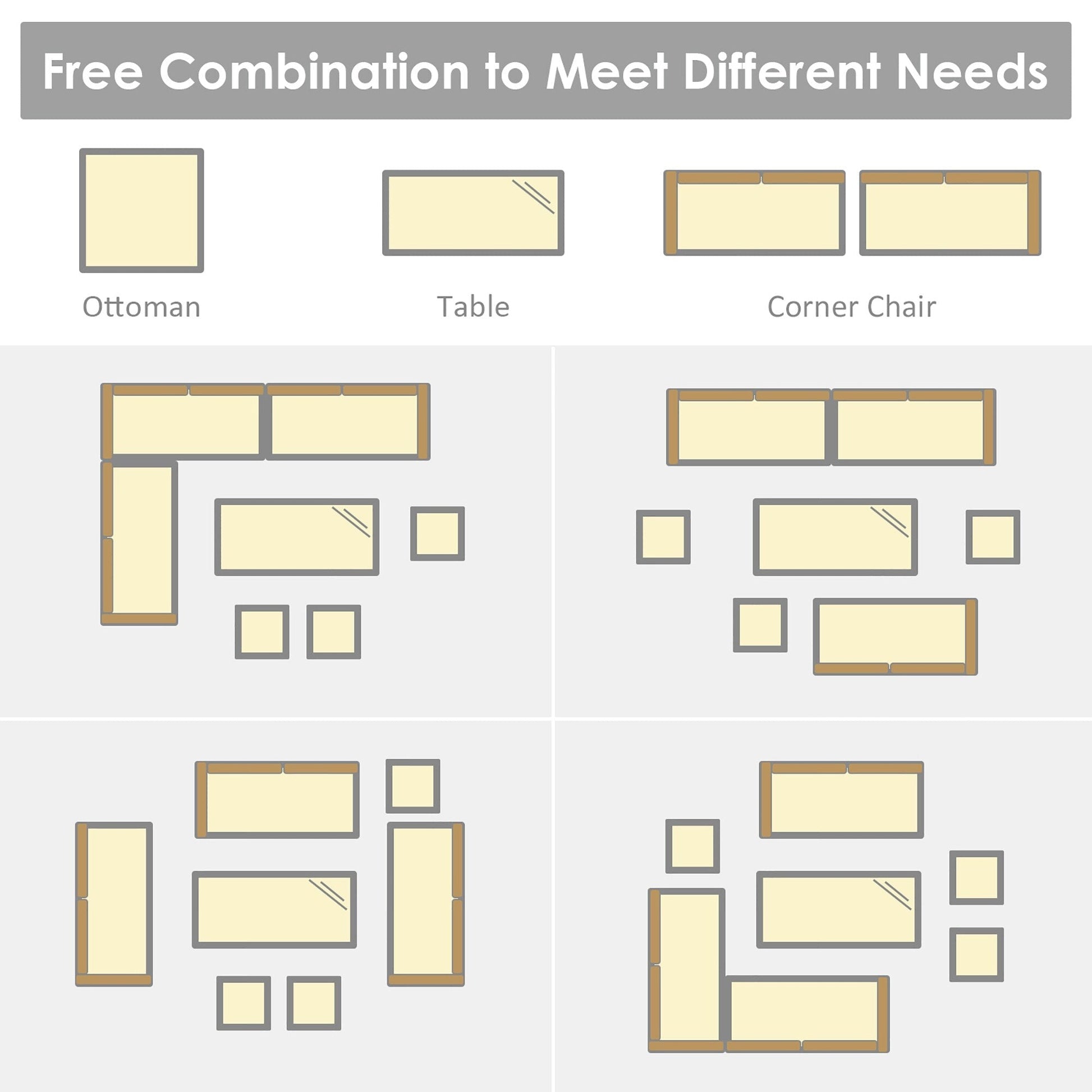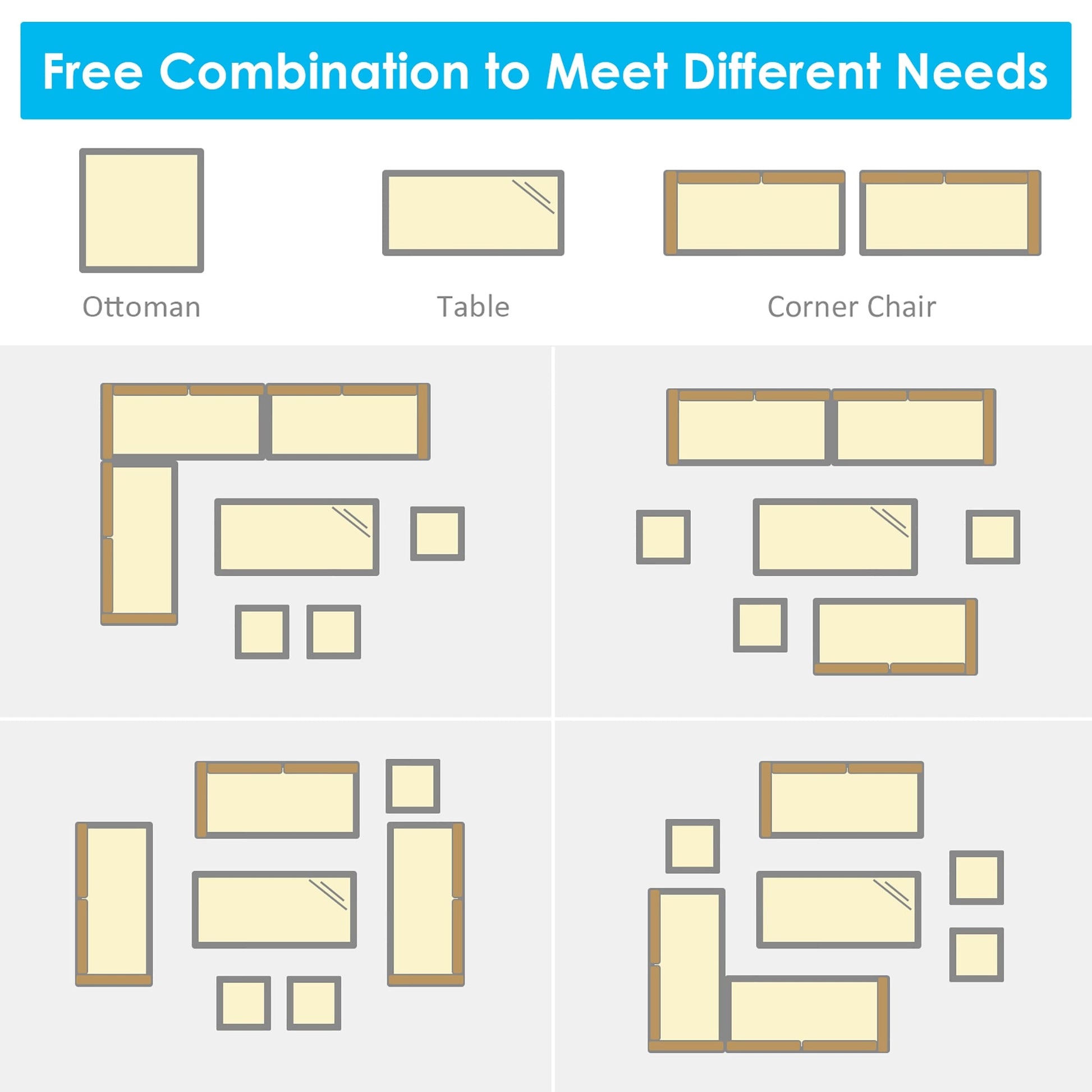 Comprend 3 chaises d'angle, 1 table et 3 poufs pour une utilisation polyvalente