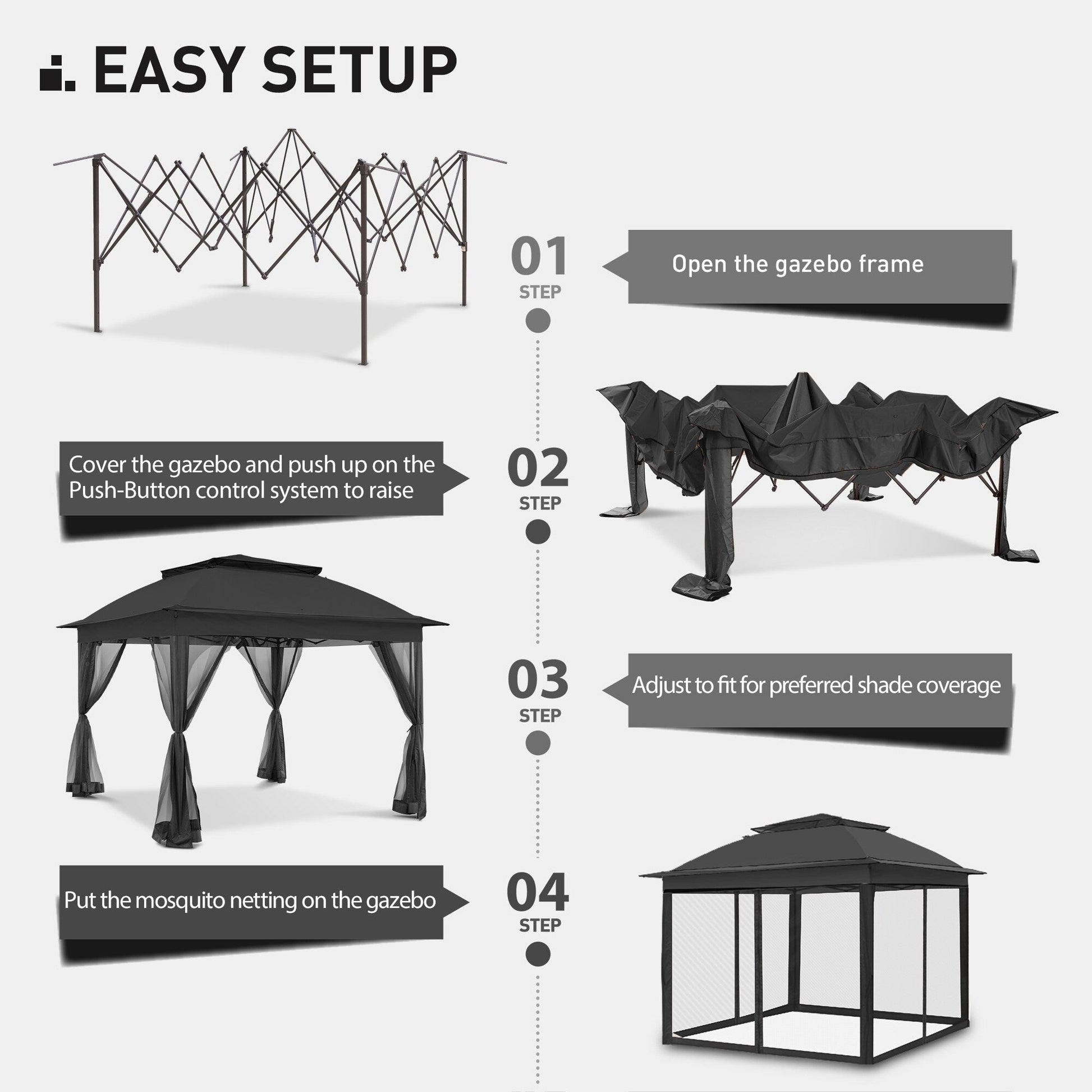 - MONTAGE FACILE ET SANS EFFORT - La tonnelle pliante COZYWOR est conçue avec un mécanisme breveté de déploiement instantané et des poteaux robustes en acier thermolaqué avec système de hauteur réglable, pour un montage rapide et sans tracas (consultez le manuel ; le montage prend moins de 10 minutes). Il est conseillé d'être au moins deux pour le montage.