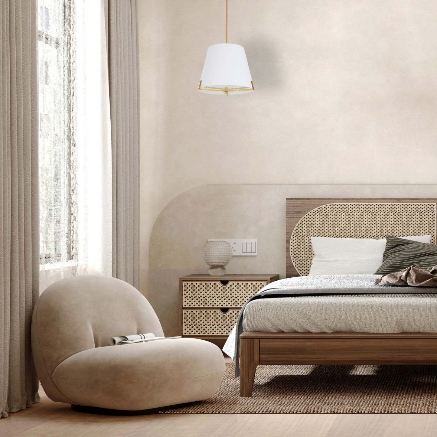 Dainolite Preston 4 Light Pendant 19 Dia Aged Brass White Fabric Shade Lamp|Luminaire suspendu Preston de Dainolite de 19 po de diamètre avec abat-jour en tissu blanc, fini laiton vieilli et 4 ampoules