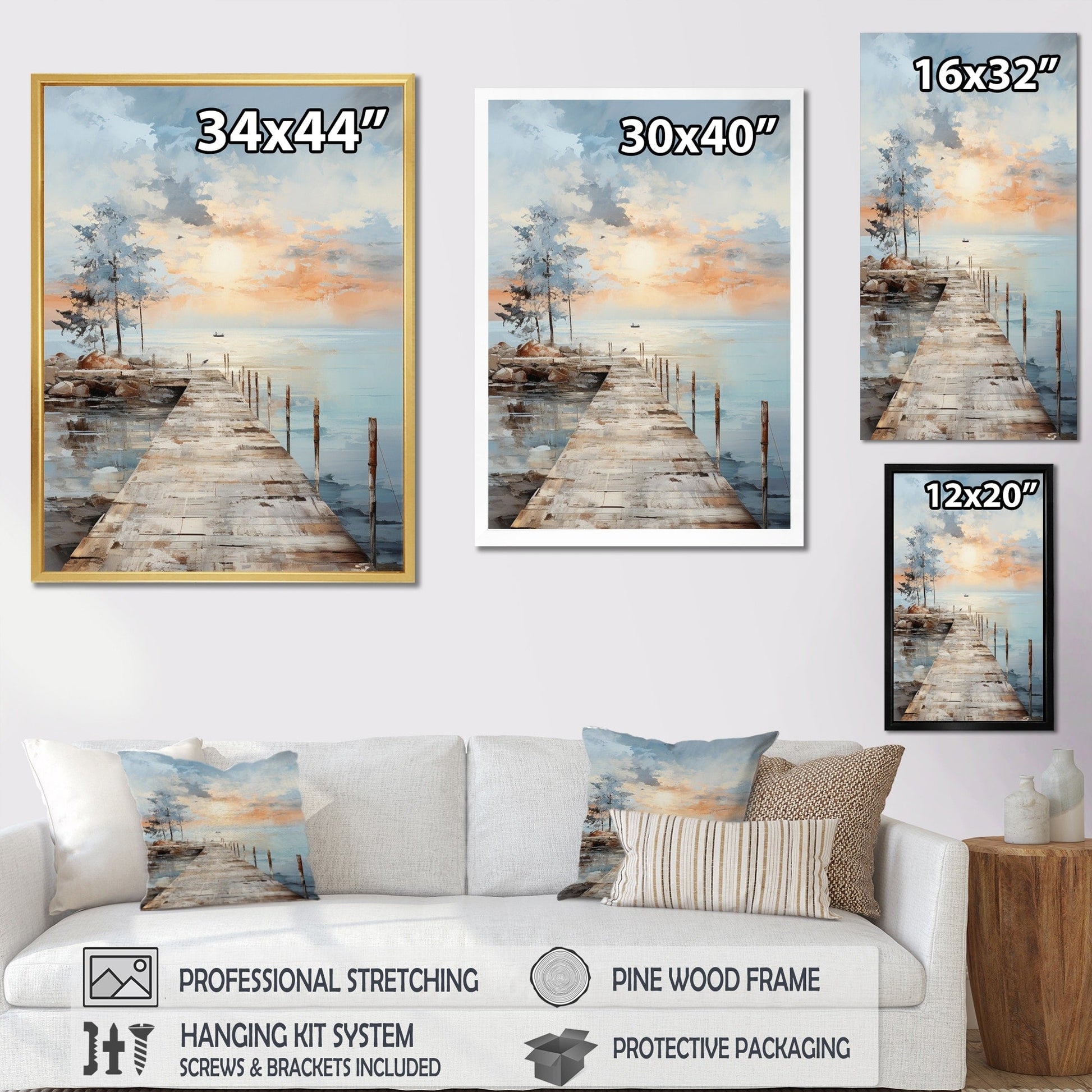 Cette magnifique toile « Jetée et quai en bord de mer III » est imprimée avec des encres de haute qualité résistantes à la décoloration. Toutes nos décorations murales sur le thème côtier sont imprimées sur une toile de coton de qualité supérieure. Chaque toile imprimée est tendue avec précision sur un châssis en bois de 2,5 cm d'épaisseur pour les petits formats et de 3,8 cm pour les grands formats (76 x 102 cm, 86 x 112 cm, etc.), garantissant ainsi une toile parfaitement tendue et sans déformation.