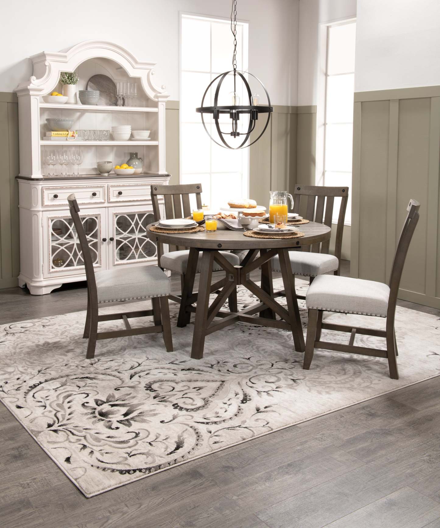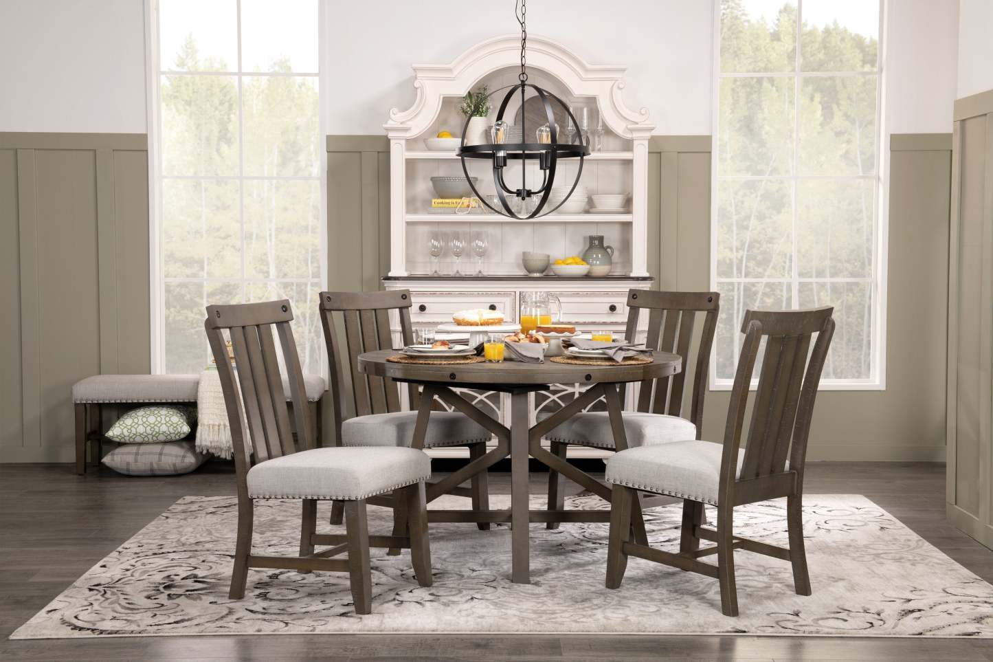 Prenez place et profitez de la nouvelle interprétation du charme rustique de cet ensemble de table à manger ronde Alto. Des placages en bois d'acacia recouvrent les pièces avec une finition gris-brun vieillie pour s'adapter à différents styles de décoration de salle à manger. De plus, grâce à la variété des motifs de grain de bois utilisés, chaque pièce est unique à votre maison. Un tissu au look lin enveloppe les sièges épais en mousse haute densité et est fixé avec des clous vieillis. Utilisez la feuille de table incluse pour vous assurer que vous pouvez facilement accueillir tout le monde. Avec des écrous en métal foncé boulonnés sur le bord de la table et les dossiers des chaises, cet ensemble ne manque ni de style ni de substance.