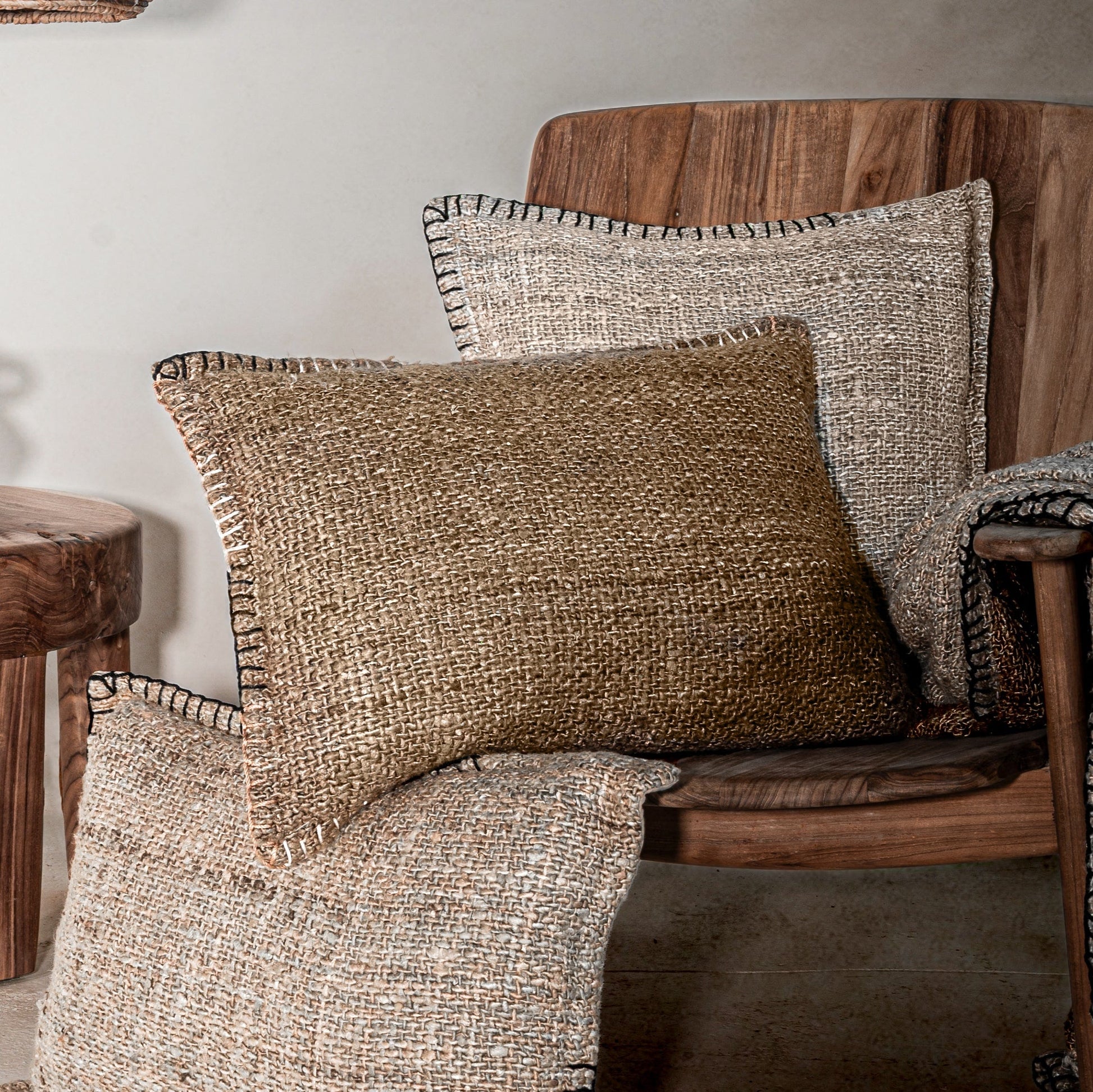 Le coussin rectangulaire Etera arbore une couture décorative faite main sur toute sa bordure, mêlant trois couleurs de fil – noir, beige et blanc cassé – pour un subtil dégradé de tons. Ce détail artisanal encadre le tissu brun rustique d'un doux contraste et d'un rythme visuel.