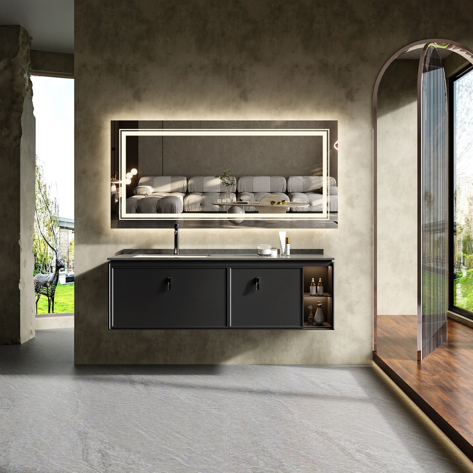 Modernisez votre salle de bain avec notre miroir mural extra large à éclairage LED, antibuée et disponible en 3 couleurs ! Profitez d'un reflet parfait pour votre routine quotidienne grâce à un éclairage haute luminosité et un IRC de plus de 90. Fini les produits antibuée : ce miroir est doté d'une fonction antibuée intégrée. Choisissez parmi 3 températures de lumière et ajustez l'intensité lumineuse grâce à la commande tactile, idéal pour votre maquillage quotidien. Fabriqué à partir de matériaux écologiques, ce miroir bénéficie d'une durée de vie LED de plus de 50 000 heures. Installez-le à l'horizontale ou à la verticale pour un style moderne et minimaliste. Garantie 3 ans et pièces de rechange d'origine incluses.