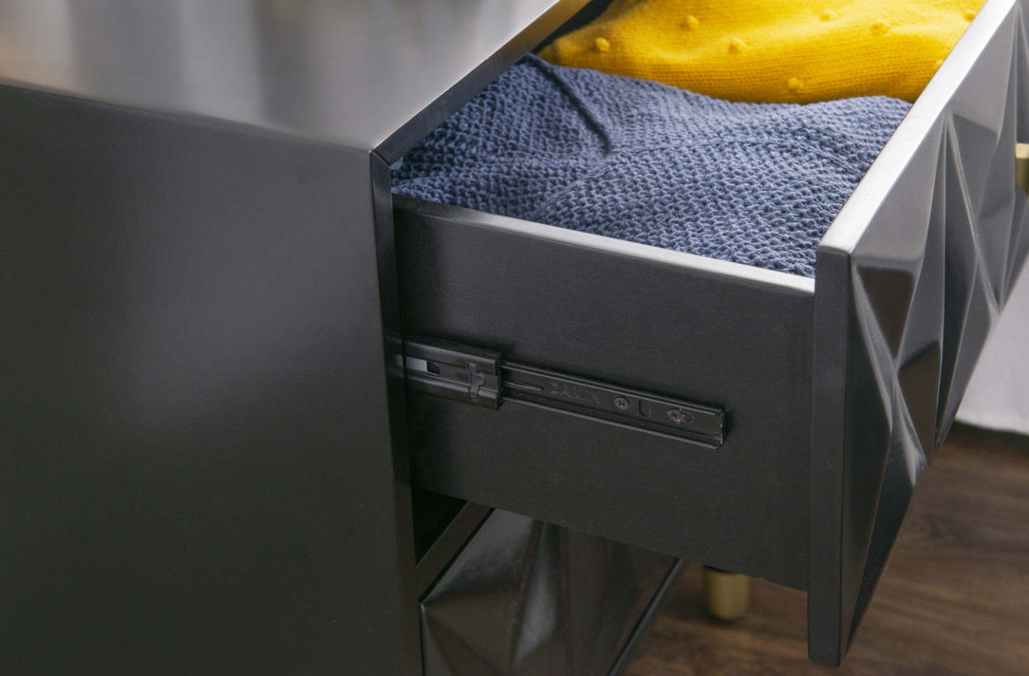 With its geometric patterned front, this geometric black nightstand will add texture and depth to your space. The nightstand has a full textured geometric front accented with square gold hardware and round, gold dipped legs. It is truly dressed to impress! Two deep drawers provide ample storage space for books, electronics and more. The black finish allows the piece to easily be incorporated into any existing decor.