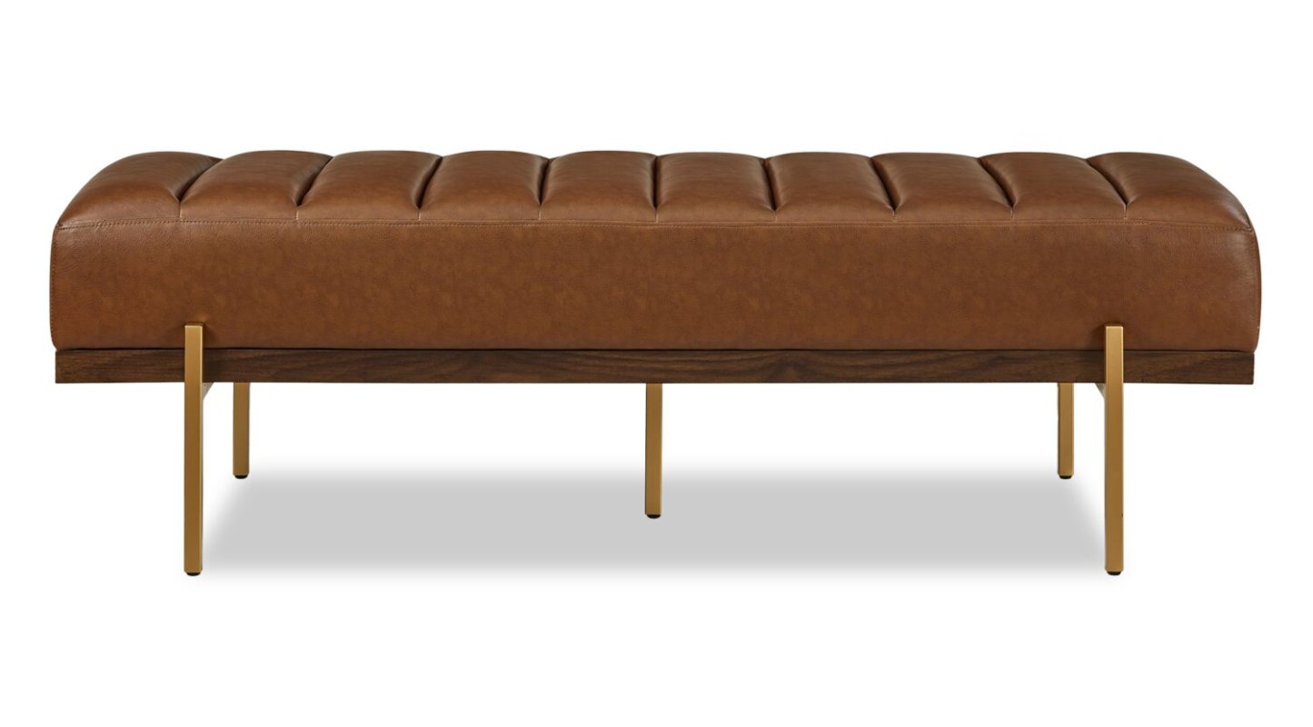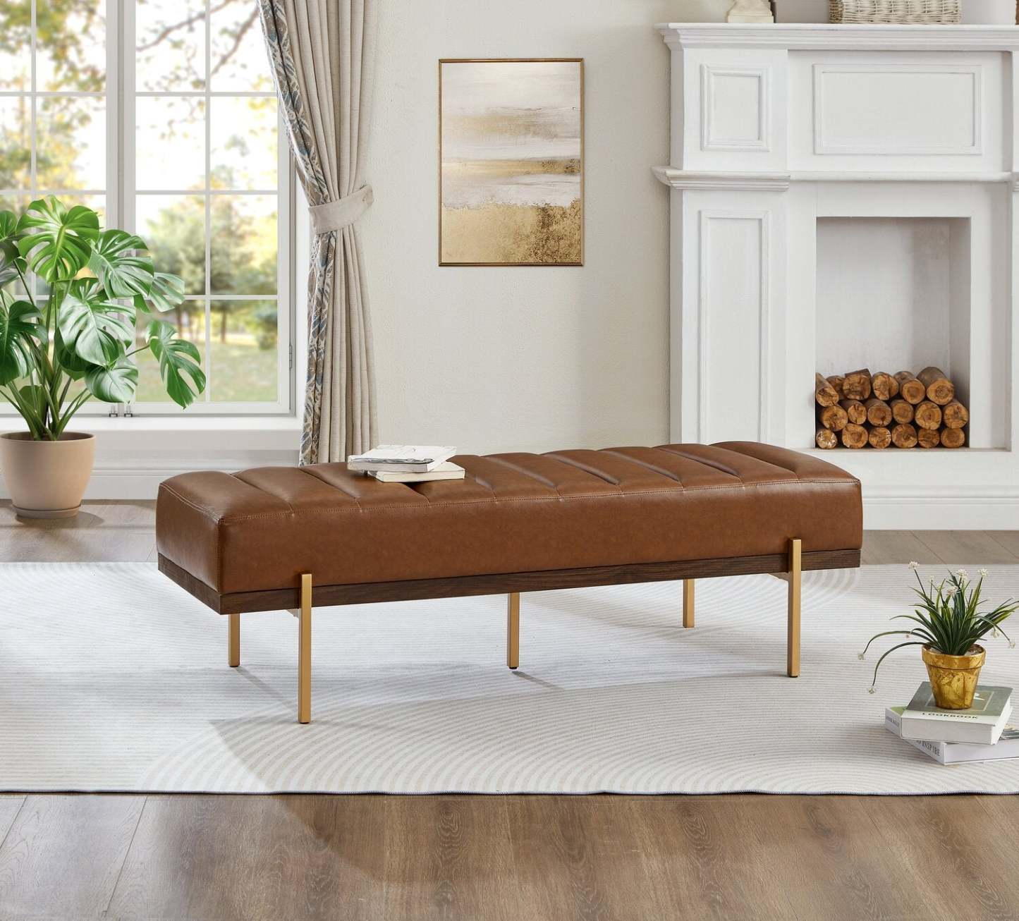 Bring comfort and style to your entryway or bedroom with the Linden bench. Designed with a cushioned seat, it offers a cozy spot to take a break. The faux leather upholstery and wood veneer seat base create a warm, inviting look, while sleek gold metal legs add a bold modern accent. Channel stitching along the seat enhances its refined appearance, making it as stylish as it is functional. Placed at the foot of your bed, along a hallway wall or by your front door, the Linden bench will bring a touch of luxury and everyday convenience to any space.