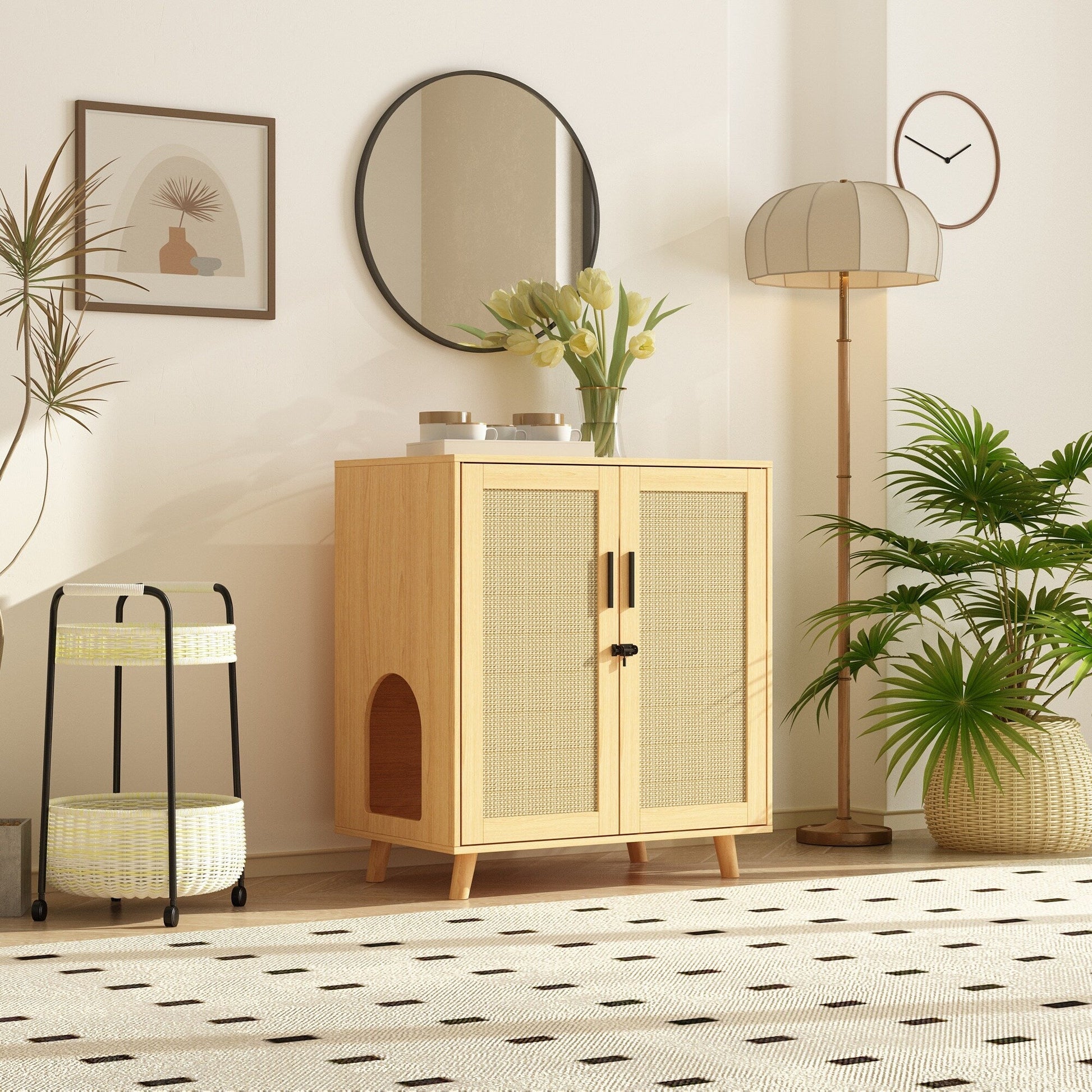 【Maison pour chat multifonctionnelle 4 en 1 :】 Ce meuble en rotin à 2 portes se transforme en une maison pour chat polyvalente répondant à divers besoins. Il dissimule la litière et offre un espace privé et confortable à votre compagnon à quatre pattes. De plus, il sert de rangement pour les friandises et les jouets, ainsi que de table d'appoint pratique dans la salle de bain ou de table de chevet, s'intégrant harmonieusement à votre décoration intérieure.