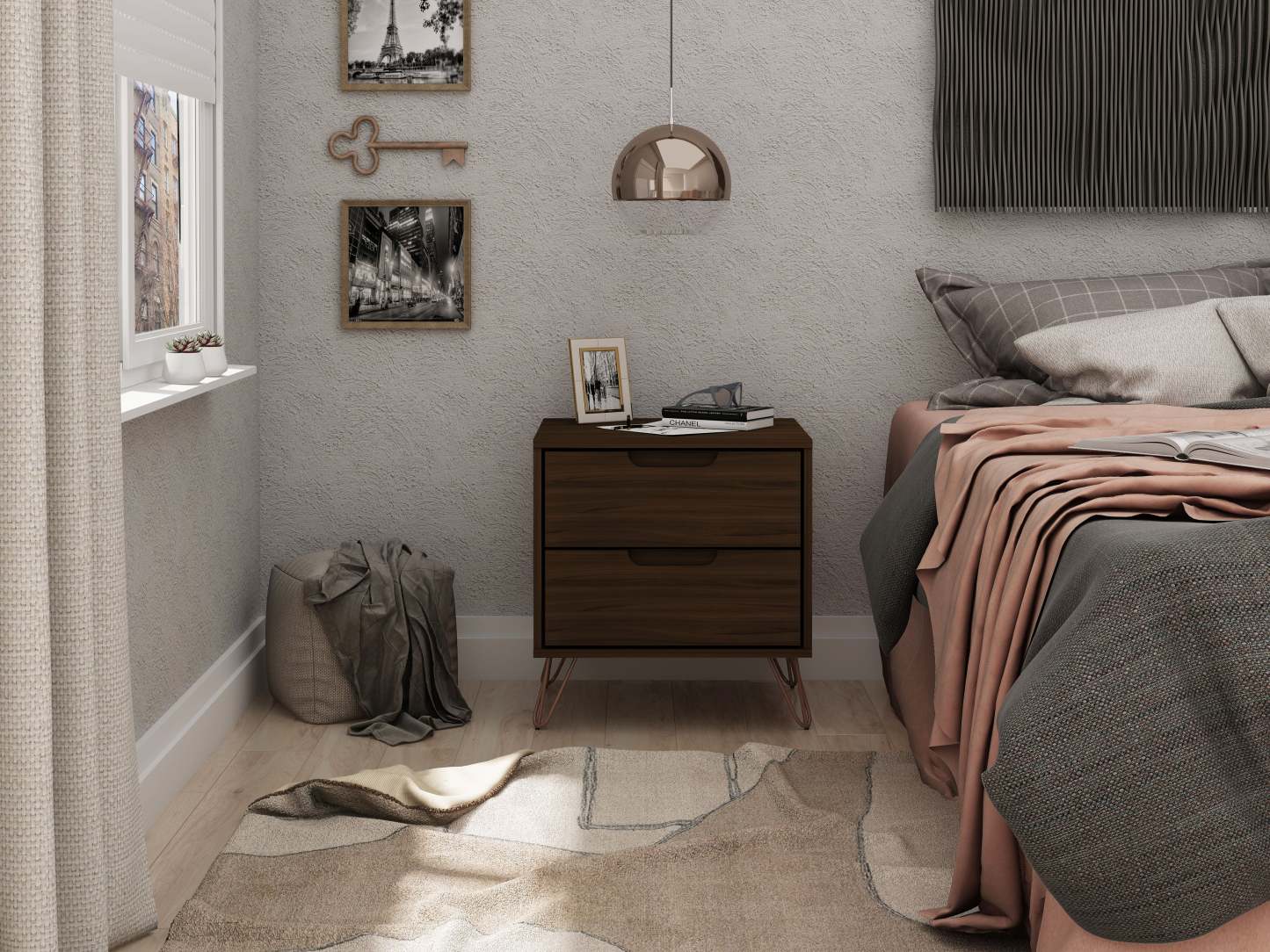 Manhattan Comfort Rockefeller Mid-Century Modern Nightstand with 2 Drawers - Brown|Table de nuit Rockefeller de Manhattan Comfort de style moderne du milieu du 20e siècle avec 2 tiroirs - brune